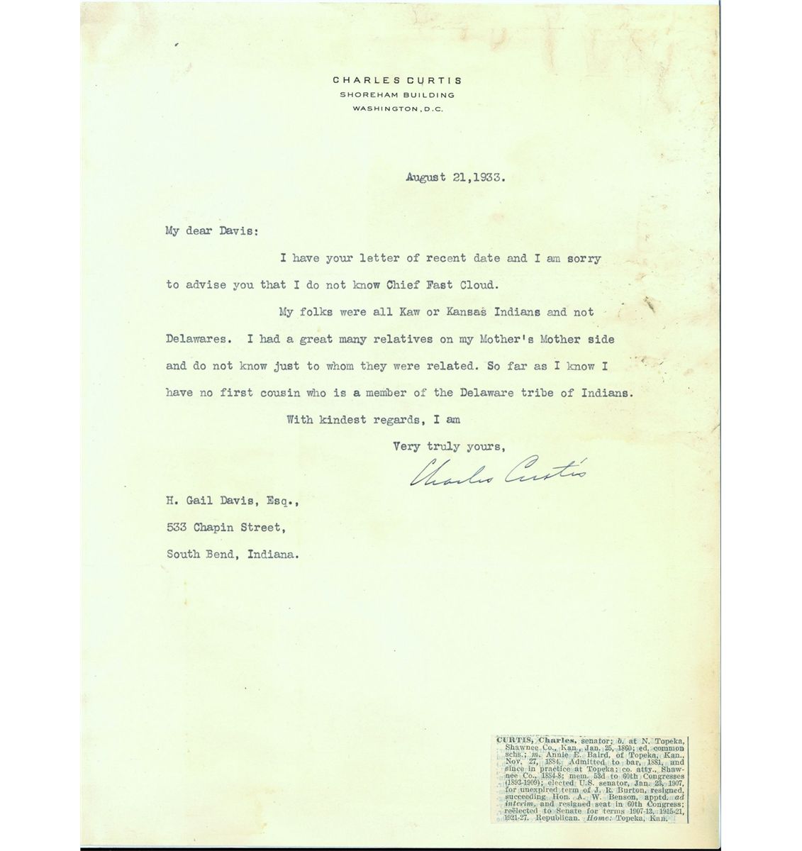 Interesting TLS letter, dated August 21,1933 by Charles Curtis, Vice President of the United States, under Herbert Hoover. He writes about his Indian ancestry in part “ My Folks where all part of the Kaw or Kansas Indians not the Delaware….. so as far as I know I have no first cousin who is a member of the Delaware tribe of Indians.”. Curtis was the first person with significant acknowledged Native American ancestry and the first person with significant acknowledged non-European ancestry to reach either of the two highest offices in the United States government's executive branch. Some toning and slights staining on top area, also old description attached to lower left, neither affects signature or letter