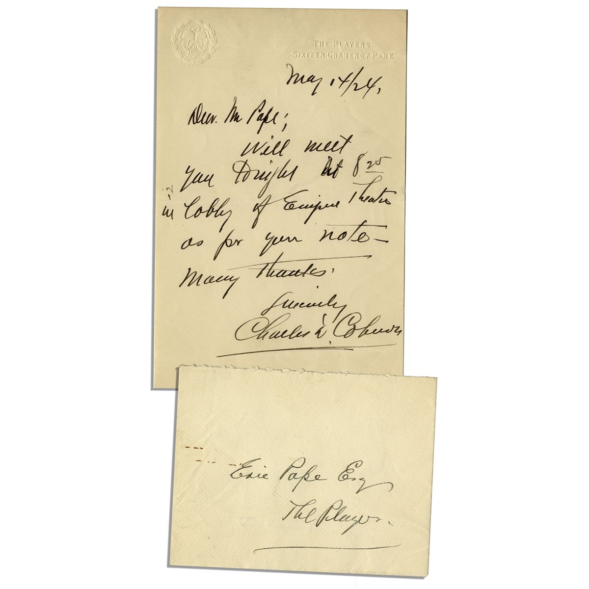 Charles D. Coburn autograph letter signed. Letter is written upon the embossed stationery of his repertory company, The Players, at Sixteen Gramercy Park. Succinct single-page letter dated 14 May 1924 reads in full, ''Dear Mr. Pape: Will meet you tonight at 8:20 in lobby of Empire Theater as per your note - Many Thanks, Sincerely, Charles D. Coburn''. Accompanied by original envelope. Measures 4.5'' x 7''. Toning, else near fine.