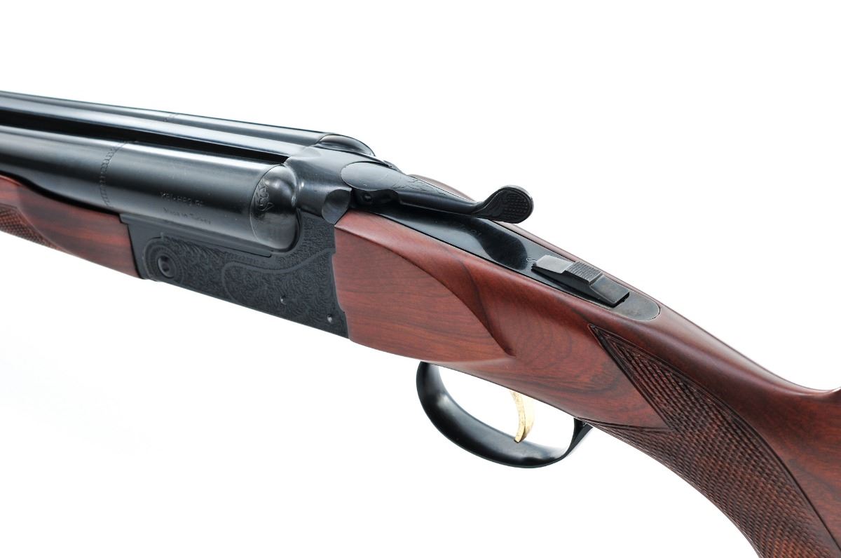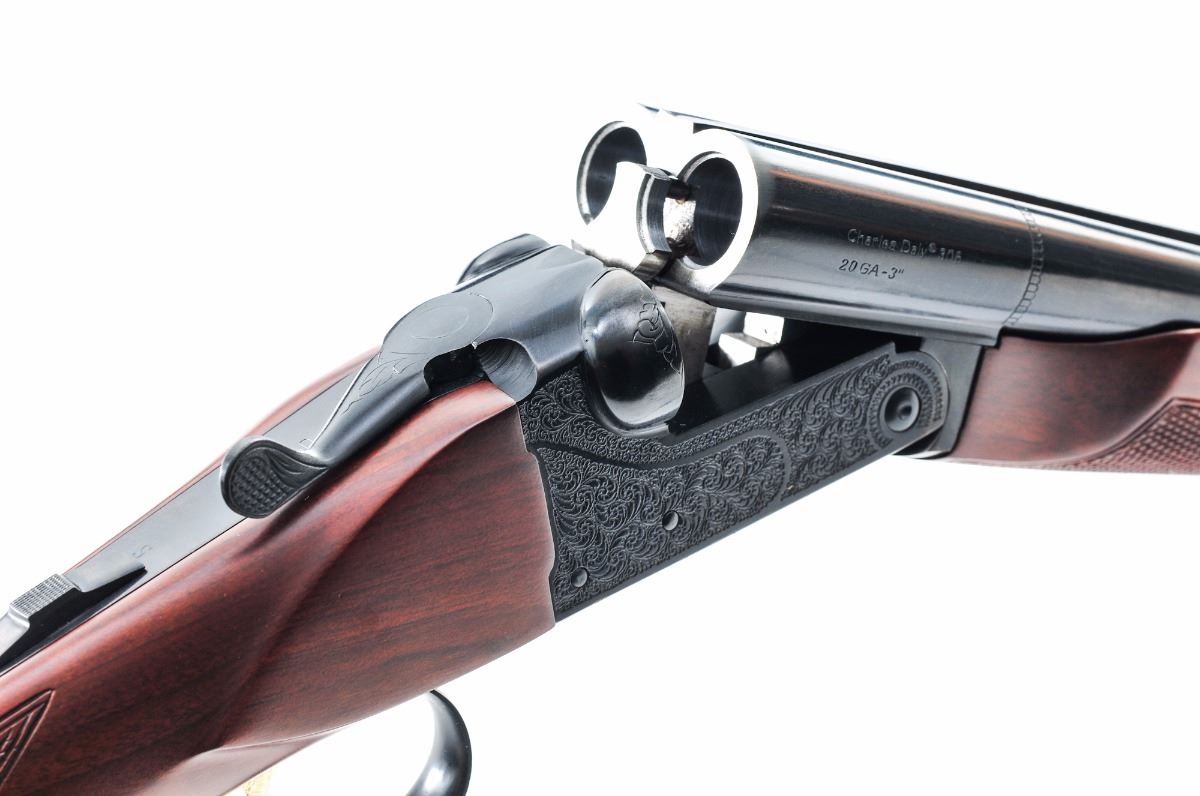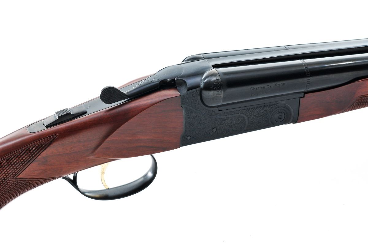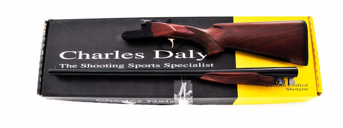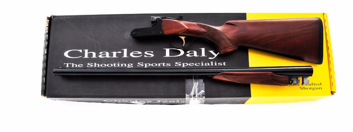 Charles Daly Model 306 Side-by-Side Shotgun, #U17621, 20 ga. chambered for 3'' shells, Mod. choke, 26'' barrel, dark blue/black finish, engraved receiver, checkered pistol-grip walnut stock and forend, black rubber recoil pad, gold-plated trigger, and brass bead front sight. Made in Turkey. In original box with matching end label, additional choke tube, and owner's manual. Condition is excellent, appearing as new. Bores show signs of very little use. Est.: $250-$400. (Modern)