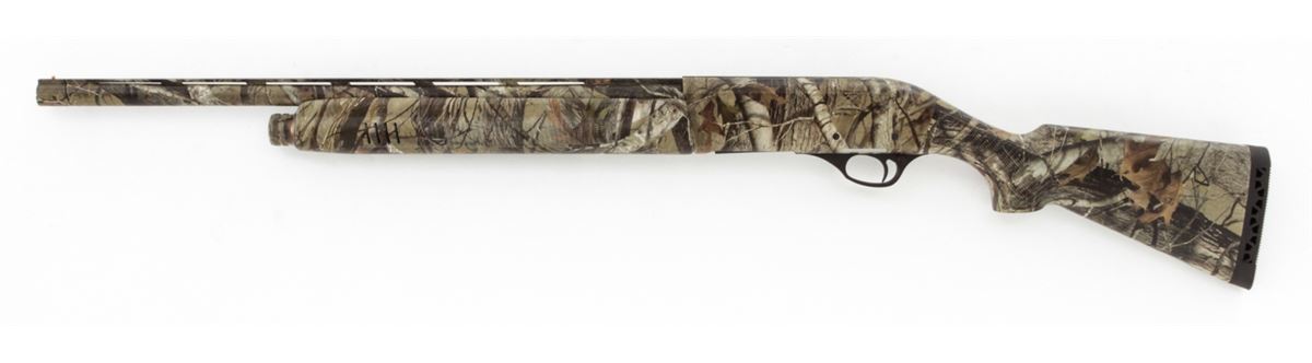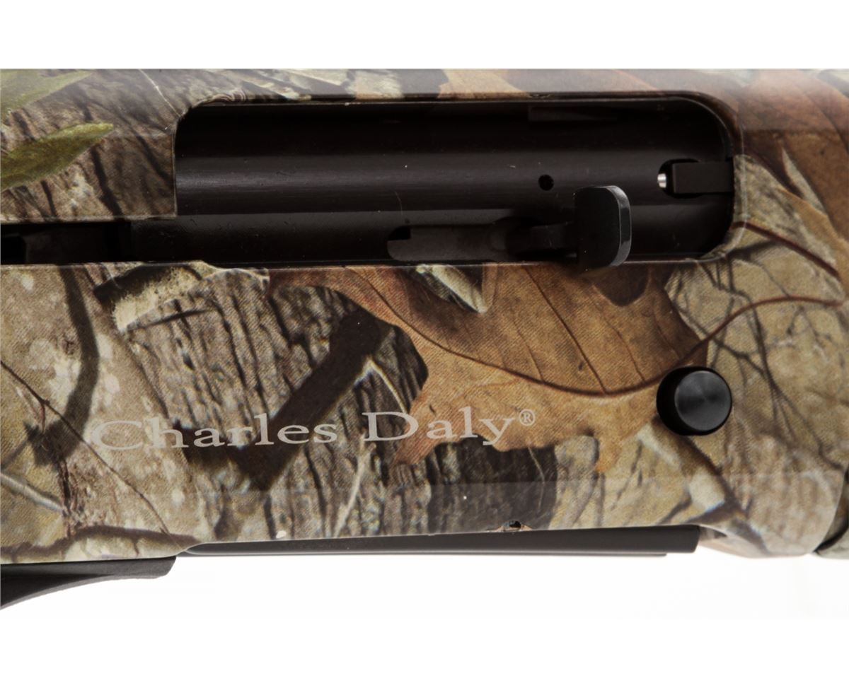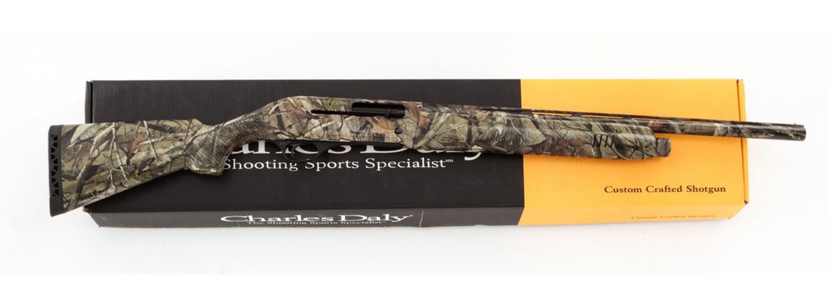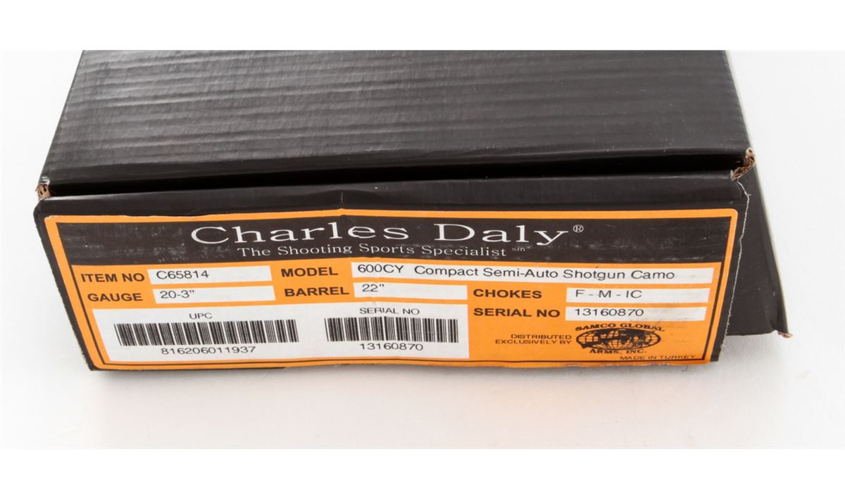 Charles Daly Model 600CY Compact Semi-Automatic Shotgun, #13160870, 20 ga., 22'' barrel, 3'' chamber, camouflage finish, checkered pistol-grip camouflage synthetic stock and forend, Charles Daly recoil pad, and three (3) choke tubes, in box with matching end label and owner's manual. Condition is excellent, remaining as new. Retails @ $529.95. Est.: $300-$500. (Modern) (Field Time)