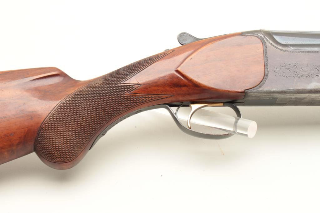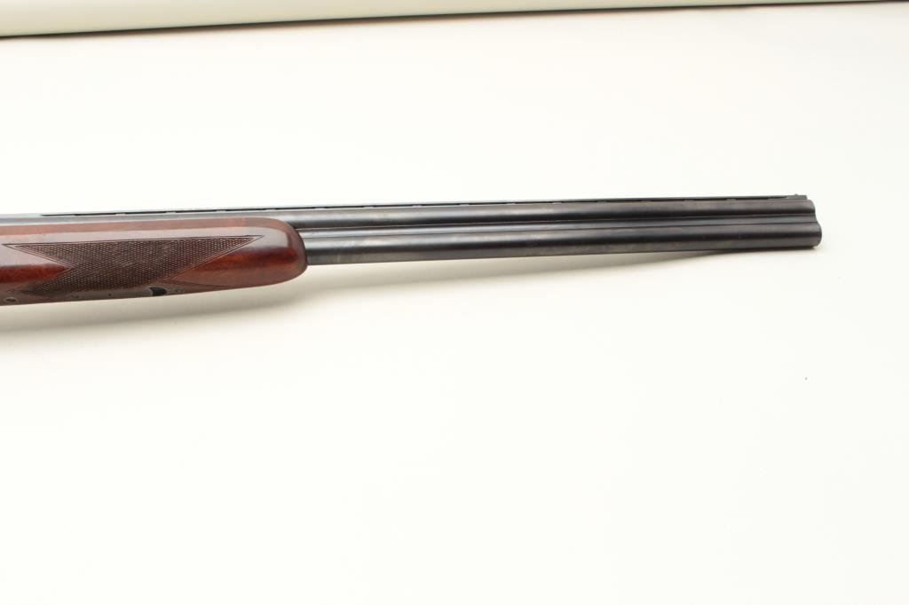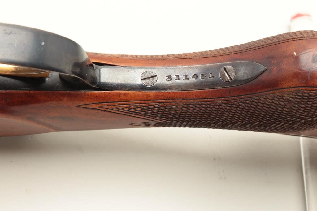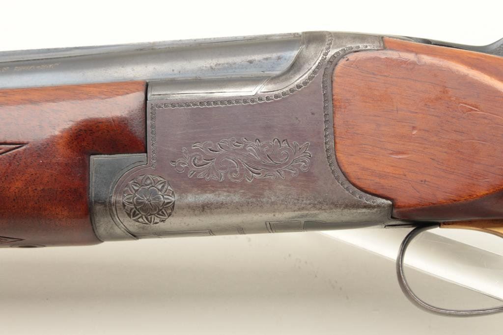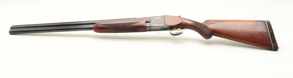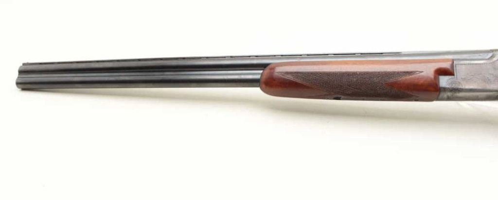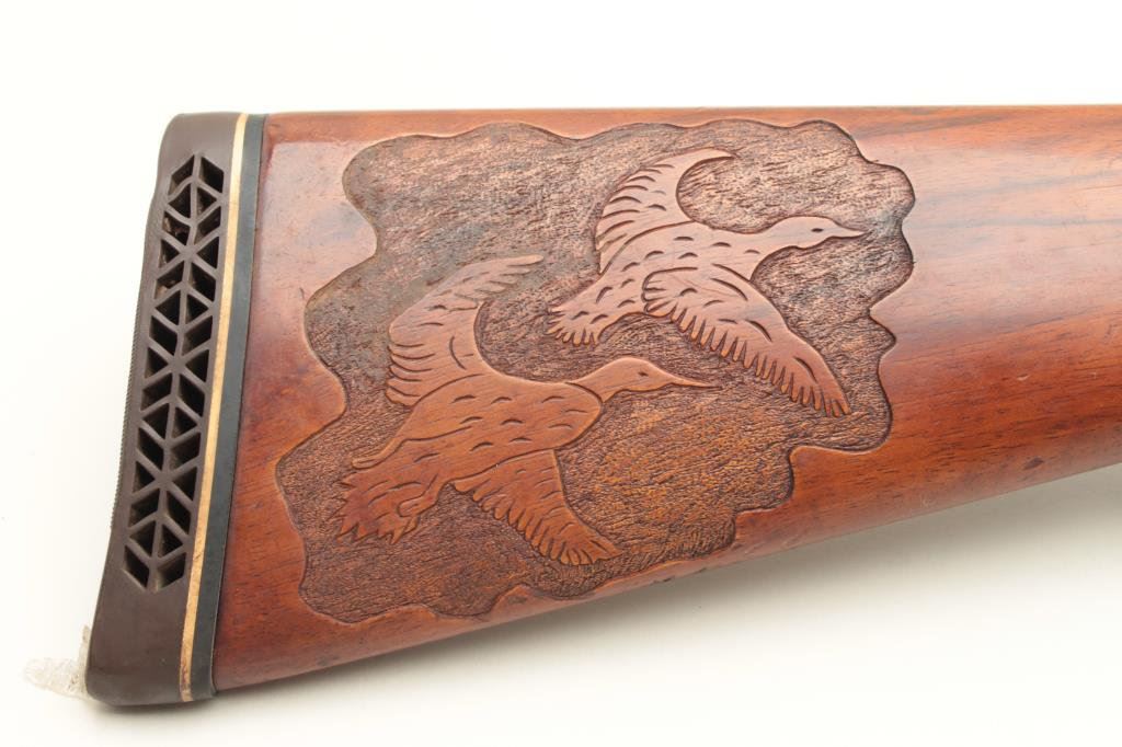 barrels, chokes marked full over modified, single trigger, auto ejectors, 14 1/2" length of pull. Shotgun is in good condition overall, showing the majority of its original finish, stocks are very good with ducks in flight embossed on the right side of the stock. Very good bores, only one barrel is firing at this time. (Modern) Est. $300-600