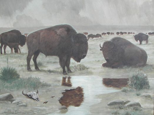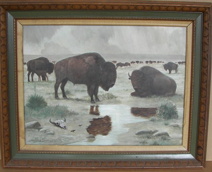 , Charles Damrow, Oil On Board, Herd Of Buffalo On The Prairie, 18" X 24", Signed Lower Left