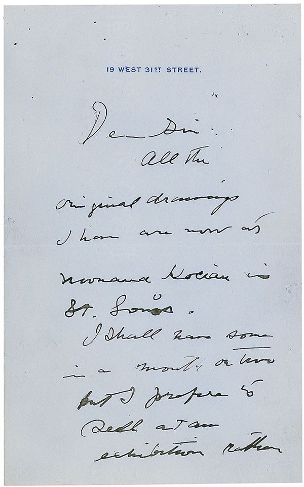 American artist (1867–1944) whose distinctive ‘Gibson Girl’ illustrations defined the image of American women at the turn of the 20th century. ALS signed “C. D. Gibson,” two pages on two adjoining sheets, 4.75 x 7.75, personal letterhead, no date. Letter to an unidentified gentleman. In full: “All the original drawings I have are now at Norman Kocian in St. Louis. I shall have some in a month or two but I prefer to sell them at an exhibition rather than separately. I am very sorry not to be able to send you some drawings.” In fine condition, with some scattered light toning and soiling and a few stray ink marks.