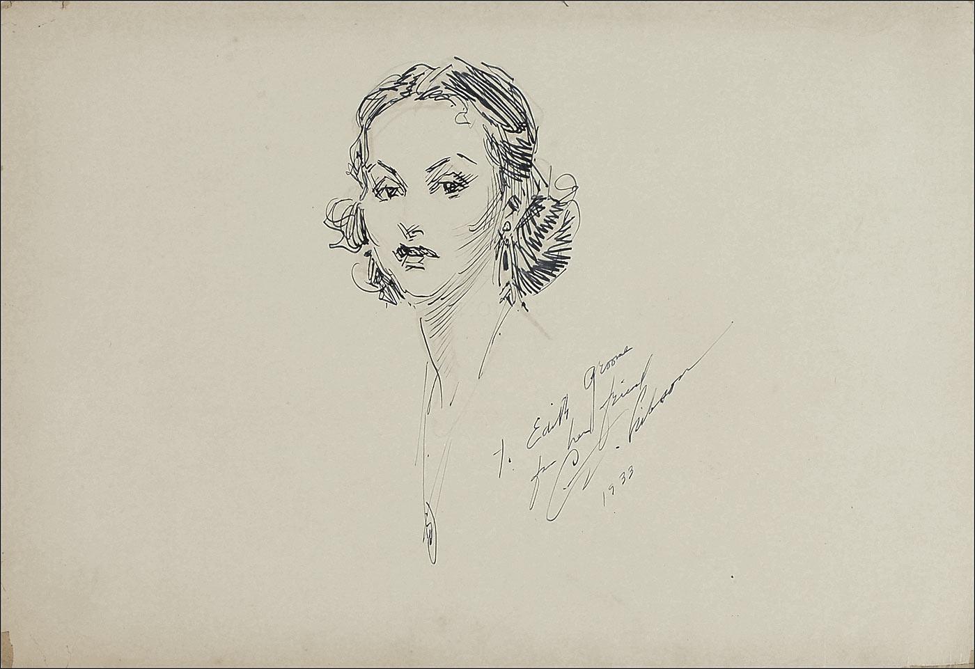 American artist (1867–1944) whose distinctive “Gibson Girl” illustrations defined the image of American women at the turn of the 20th century. Original vintage signed and inscribed ink sketch of a woman on an off-white 16.5 x 11.5 book page, with “The Education of Mr. Pipp,” printed on the reverse, signed and inscribed “To Edith Groome, from her friend, C. D. Gibson.” In fine condition, with scattered edge wear and creasing, some mild soiling, and a few pieces of old tape around edges.
