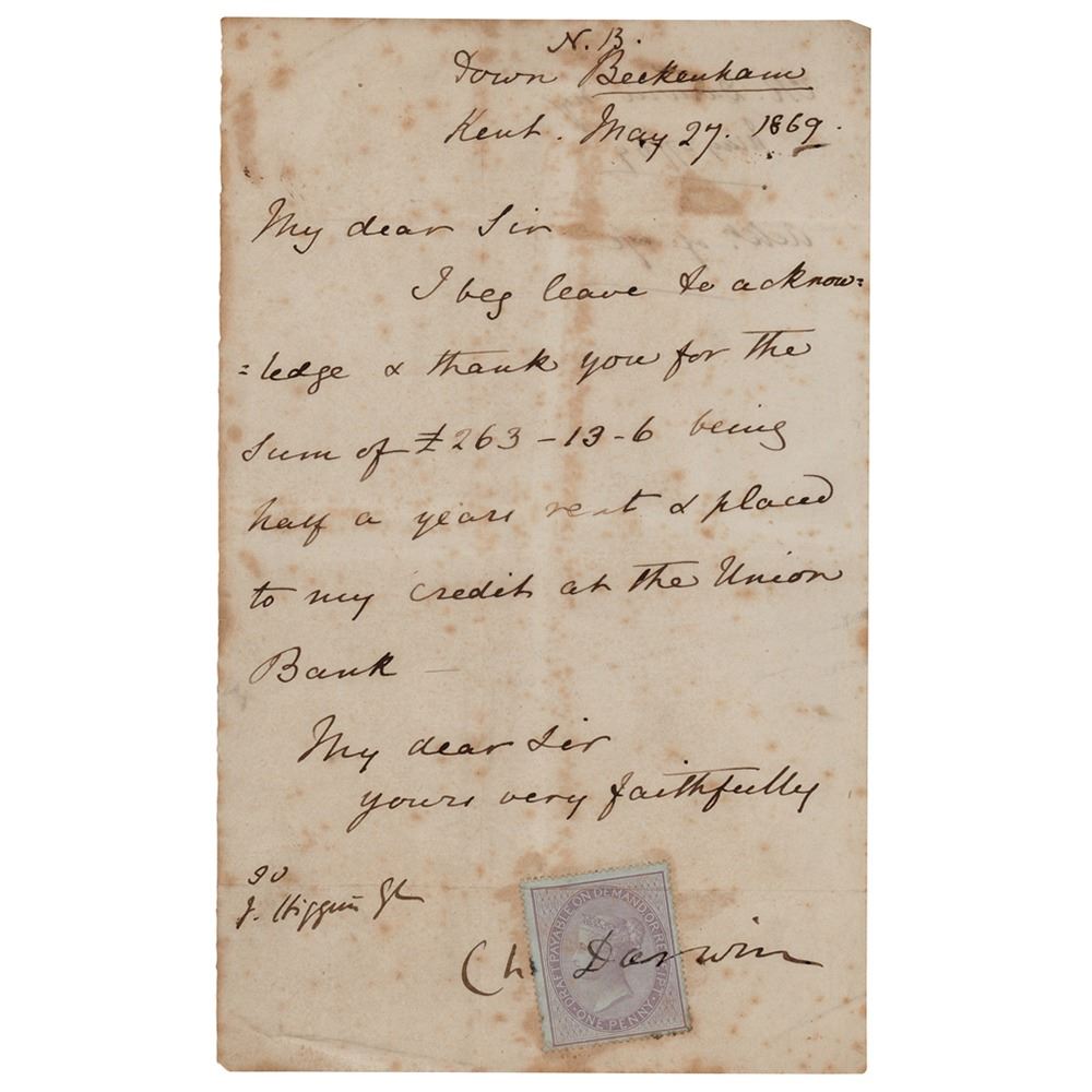 ALS signed “Ch. Darwin,†one page, 5 x 8, May 27, 1869. Handwritten letter to his land agent and financial advisor John Higgins, in part: "I beg leave to acknowledge the sum of £263-13-6 being half a year of rent I placed to my credit at the Union Bank." Signed at the conclusion by Darwin over an affixed one-penny stamp. In very good to fine condition, with creasing to the bottom corners, and scattered staining affecting only appearance. This payment probably represents rent from Darwin's farm in Beesby, and dates to the time he worked on his publication 'The Descent of Man and, Selection in Relation to Sex.' Catalogued by the Darwin Correspondence Project (D.C.P.) based at Cambridge library as no. 6759F.