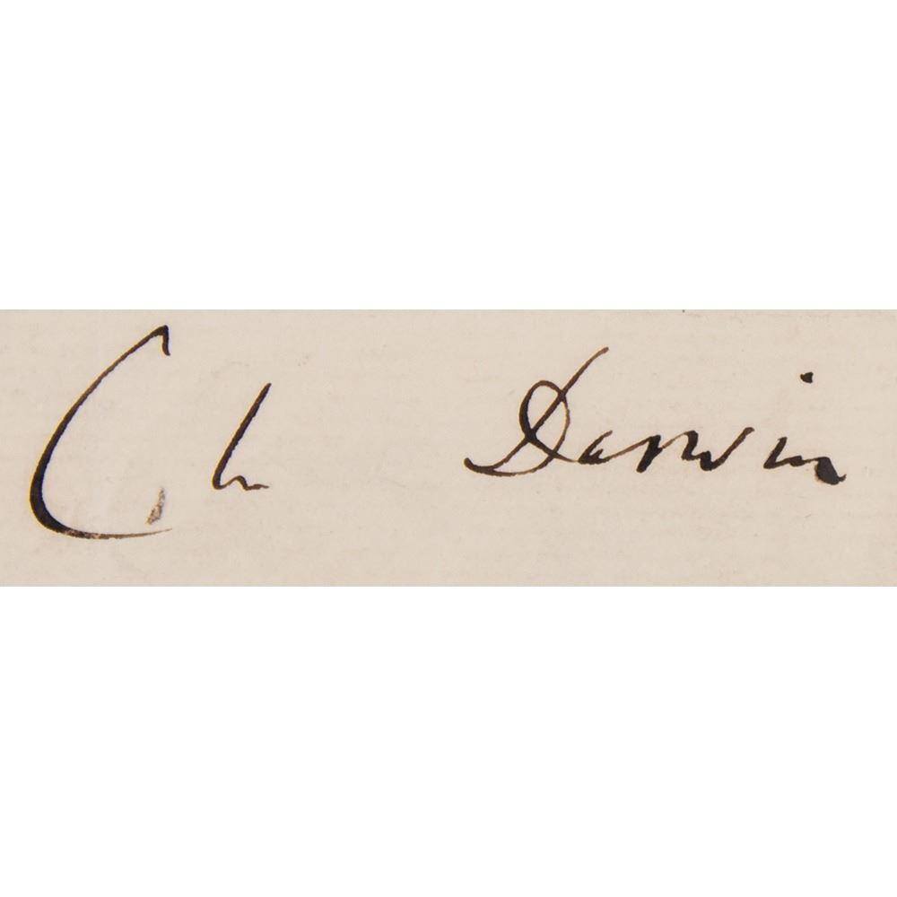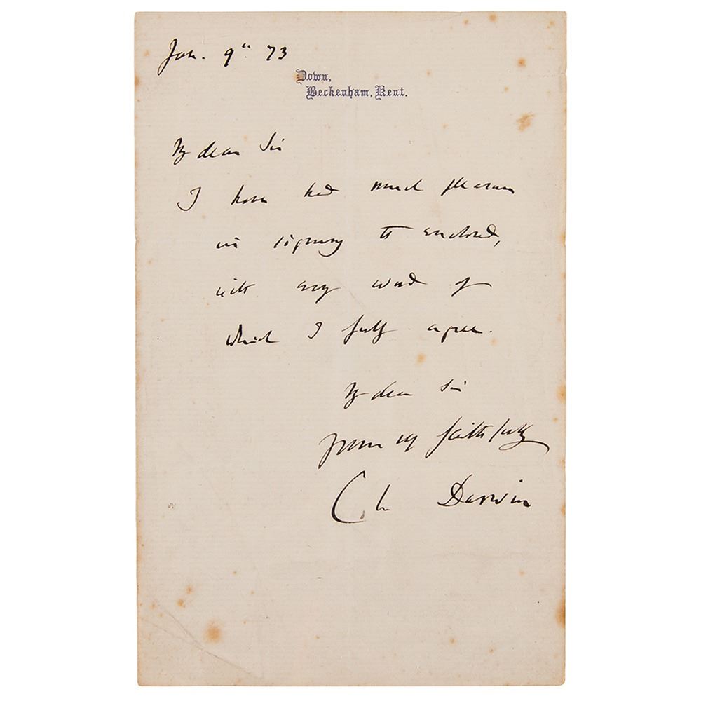 ALS signed “Ch. Darwin,” one page, 5 x 7.75, Down, Beckenham, Kent letterhead, January 9, 1873. Neatly penned handwritten letter to an unidentified gentleman, who had requested Darwin to sign some sort of petition or document, in full: “I have had much pleasure in signing the enclosed, with every word of which I fully agree.” In very good to fine condition, with light corner creasing, and scattered foxing.