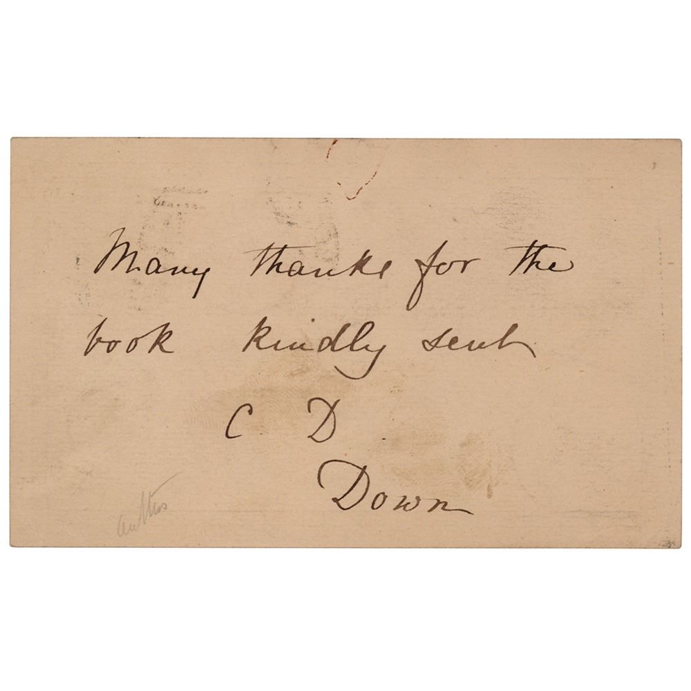 ANS signed “C. D.,†one page on a 4.75 x 3 postcard, postmarked 1873. Handwritten note by Charles Darwin to American abolitionist and writer Moncure Conway, in full: "Many thanks for the book kindly sent, C. D., Down." Addressed on the reverse in Darwin's hand. In very good to fine condition, with mounting remnants to the address side of the postcard. Accompanied by an unsigned original carte-de-visite portrait of Darwin by Barraud & Jerrard. Conway moved to London amidst the Civil War and lived in Europe for the rest of his life, traveling in intellectual circles; in addition to Darwin, he counted the likes of Charles Dickens, Robert Browning, Thomas Carlyle, and Charles Lyell amongst his friends.