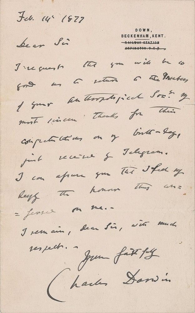 ALS, one page, 5 x 8, personal letterhead, February 14, 1877. Letter of thanks for good wishes on the occasion of his 68th birthday, in full: “I request that you will be so good as to return to the Members of your Anthropological Society my most sincere thanks for their congratulations on my birth-day, just received by telegram. I can assure you that I feel very deeply the honor thus conferred on me.” In fine condition, with usual mailing folds and a faint paperclip impression to upper left corner. Despite repeated bouts with illness as he neared the end of his life, Darwin continued his important work. In 1877, he published The Different Forms of Flowers on Plants of the Same Species. This was the fifth of his six books dedicated solely to the study of plants, and contributed to his pursuit of evidence that would support his theory of natural selection. A boldly penned, highly desirable letter from one of the most influential scientists of modern times.