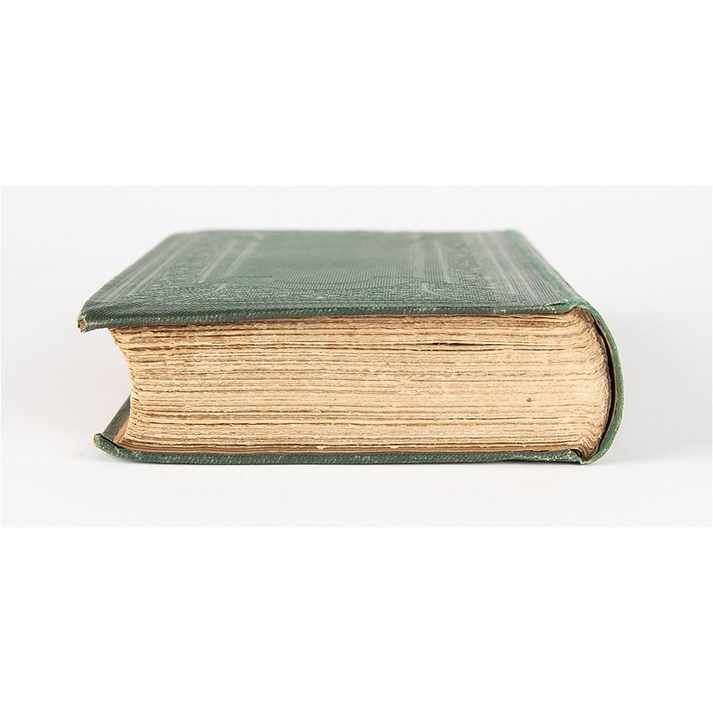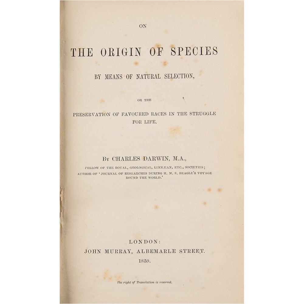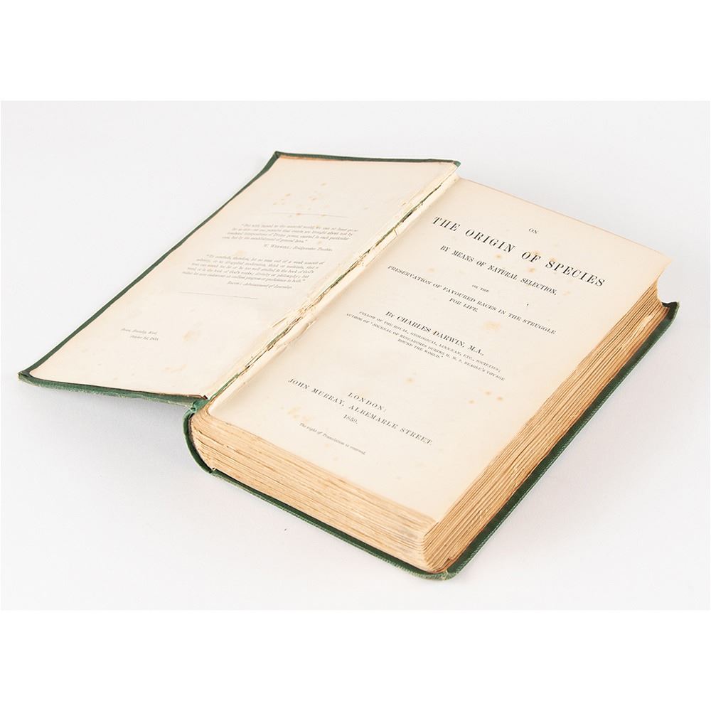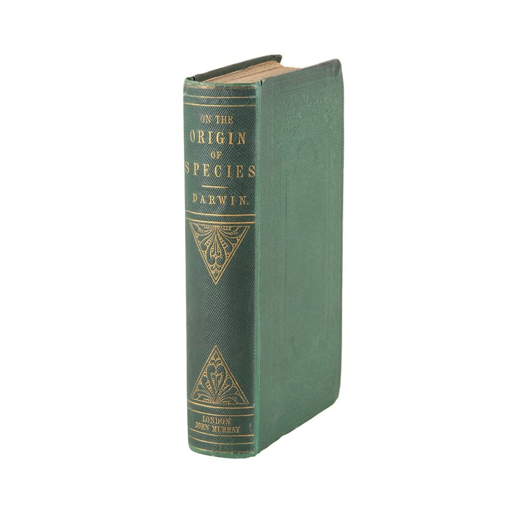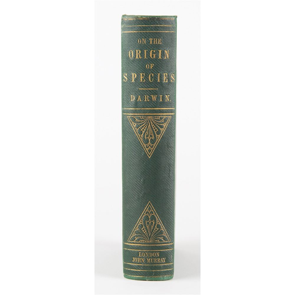 Rare, historic, and influential first edition book: On the Origin of Species by Means of Natural Selection, or the Preservation of Favoured Races in the Struggle for Life by Charles Darwin. First edition. London: John Murray, 1859. Hardcover with chocolate brown endpapers with binder's ticket of "Edmonds & Remnants, London" on rear endpaper, original green blindstamped cloth, lettered in gilt on spine (Binding Variant B), neatly rebacked retaining the original spine, hinges neatly repaired, slightly spotted, very slight loss at extreme inner margin of title page. Complete with endpapers, half-title, folding diagram, 502 pages, and 32 pages of inserted publisher's advertisements (dated June 1959). Book condition: VG-/None, with title page and first page of table of contents partially detached, foxing to first several pages, bumped corners, and edgewear.