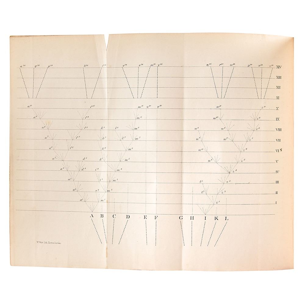 There is only one issue of the first edition of On the Origin of Species (Freeman 373), the text being identical in all copies. There are however very slight differences in the binding, this copy corresponding to Variant B: the L in LONDON is over the right upright of H in JOHN; and the right upright of the second N in LONDON is well to the right of the upright of the second R in MURRAY.