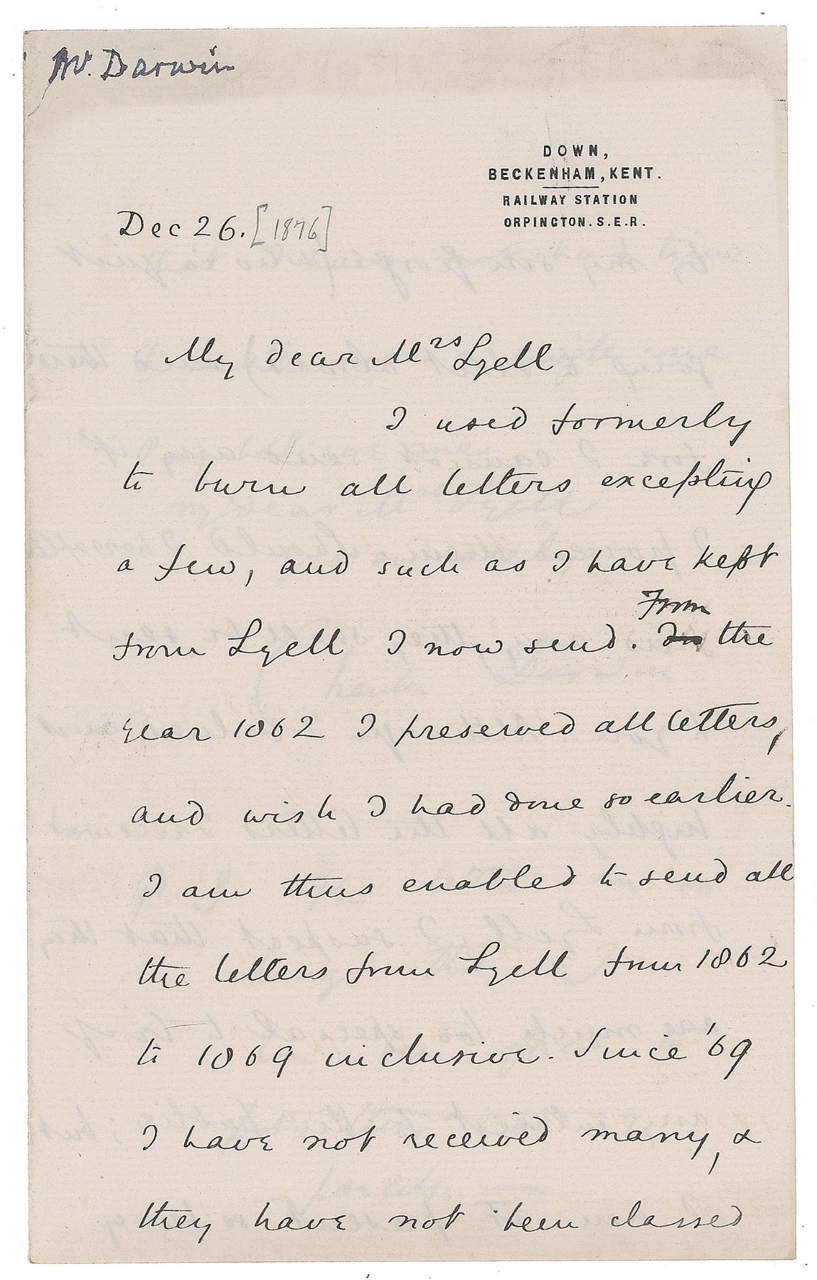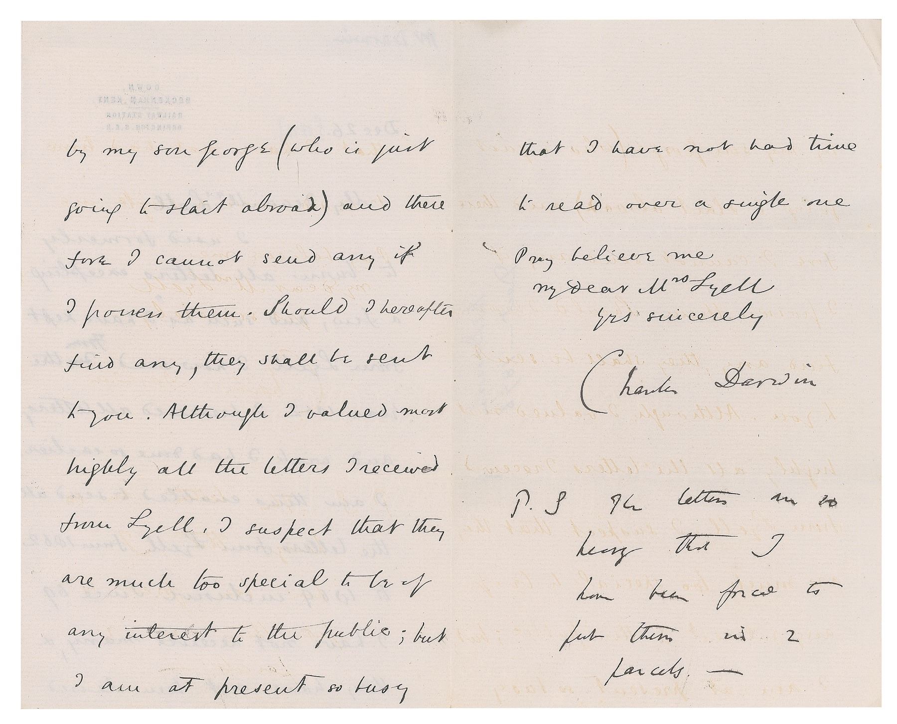 LS signed "Charles Darwin," three pages on two adjoining sheets, 5 x 8, Down letterhead, December 26, 1876. Letter to Katharine Murray Lyell, responding to her request for any correspondence that may have passed between him and his mentor, the geologist Charles Lyell. In part: "I used formerly to burn all letters excepting a few, and such as I have kept from Lyell I now send. From the year 1862 I preserved all letters, and wish I had done so earlier. I am thus enabled to send all the letters from Lyell from 1862 to 1869 inclusive…Although I valued most highly all the letters I received from Lyell, I suspect that they are much too special to be of any interest to the public; but I am at present so busy that I have not had time to read over a single one." After prominently signing at the conclusion, he adds a handwritten postscript: "P.S. The letters are so heavy that I have been forced to put them in 2 parcels." In fine condition.