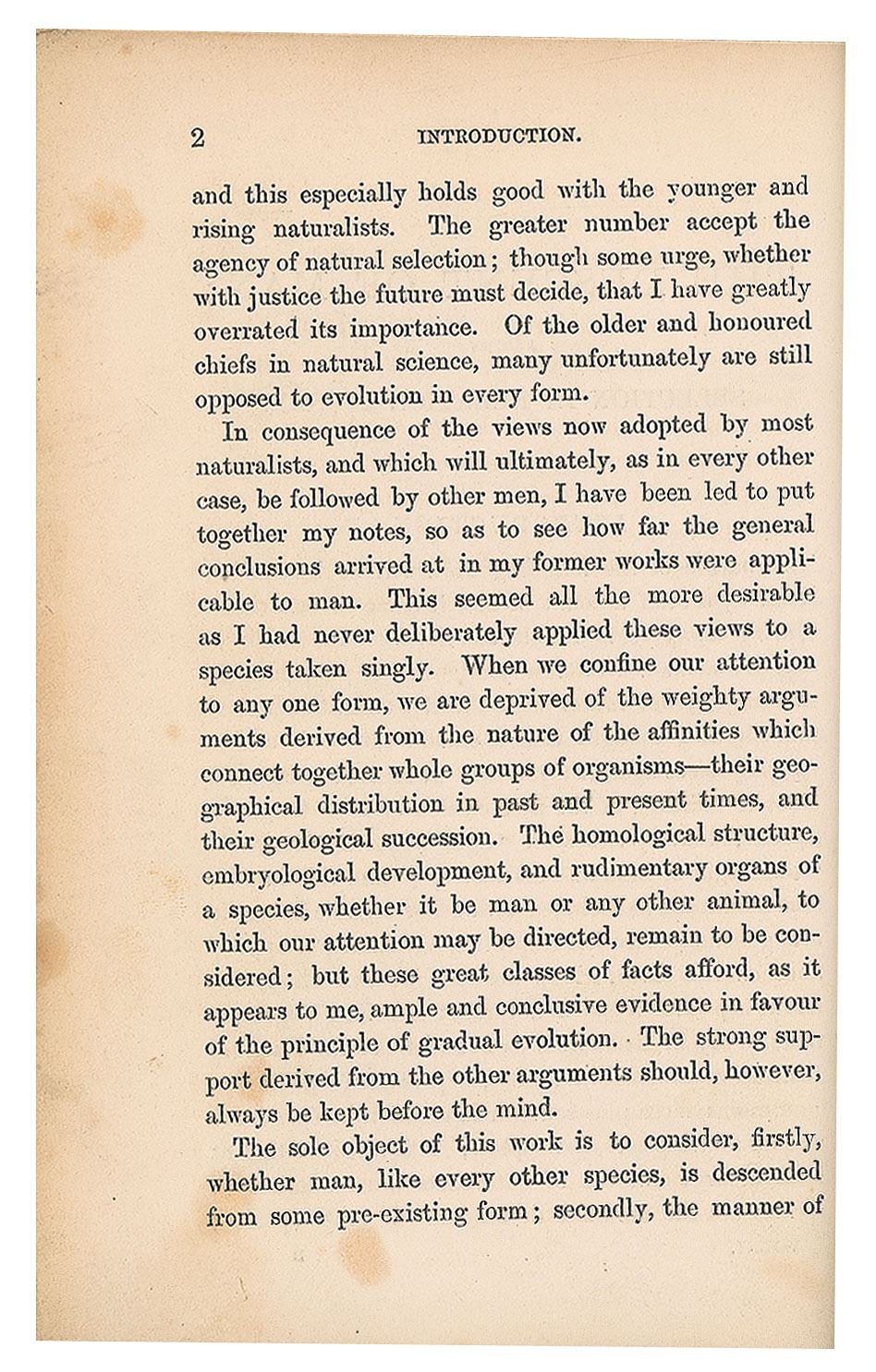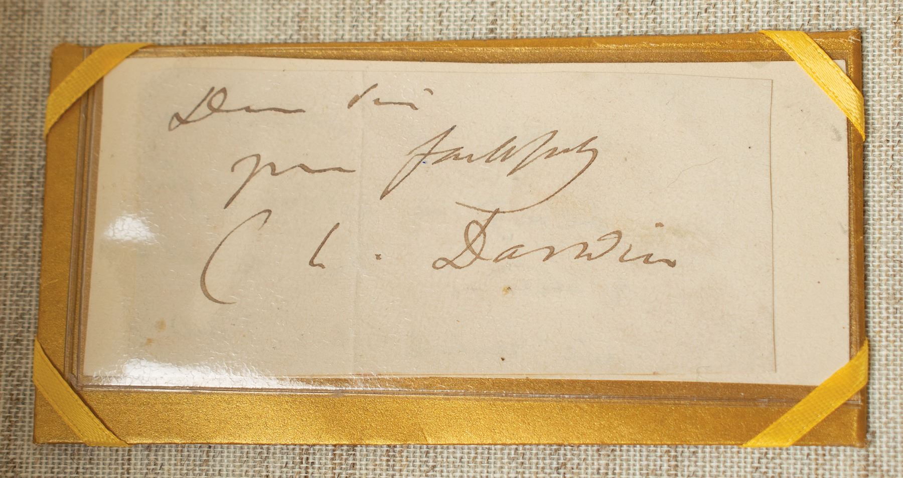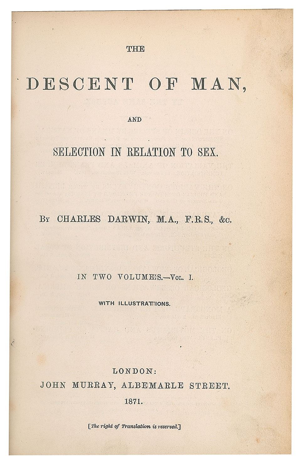 Desirable ink signature, "Dear Sir, yours faithfully, Charles Darwin,” on an off-white 3.5 x 1.5 slip, removably corner-mounted inside the front of the custom-made cloth clamshell case for the first edition, first issue of Darwin's landmark book, The Descent of Man, and Selection in Relation to Sex, in Two Volumes. London: John Murray, 1871. Two volumes bound in three-quarter tan calf, gilt spine, marbled boards, red labels, raised bands, speckled edges, 5.25 x 7.25, totaling 898 pages. First edition points of issue include "transmitted" on line 1 of page 297, Vol. I; printer's note on verso of half-title of Vol. II; and author's postscript tipped in on page ix-x of Vol. II. Autographic condition: fine. Book condition: VG/None, with edgewear, some rubbing and scratching to leather, occasional mild foxing, and small ownership labels to front pastedowns. A handsomely bound first issue of an immensely important book—the first of Darwin's works to include the word "evolution," on the second page of the first volume.