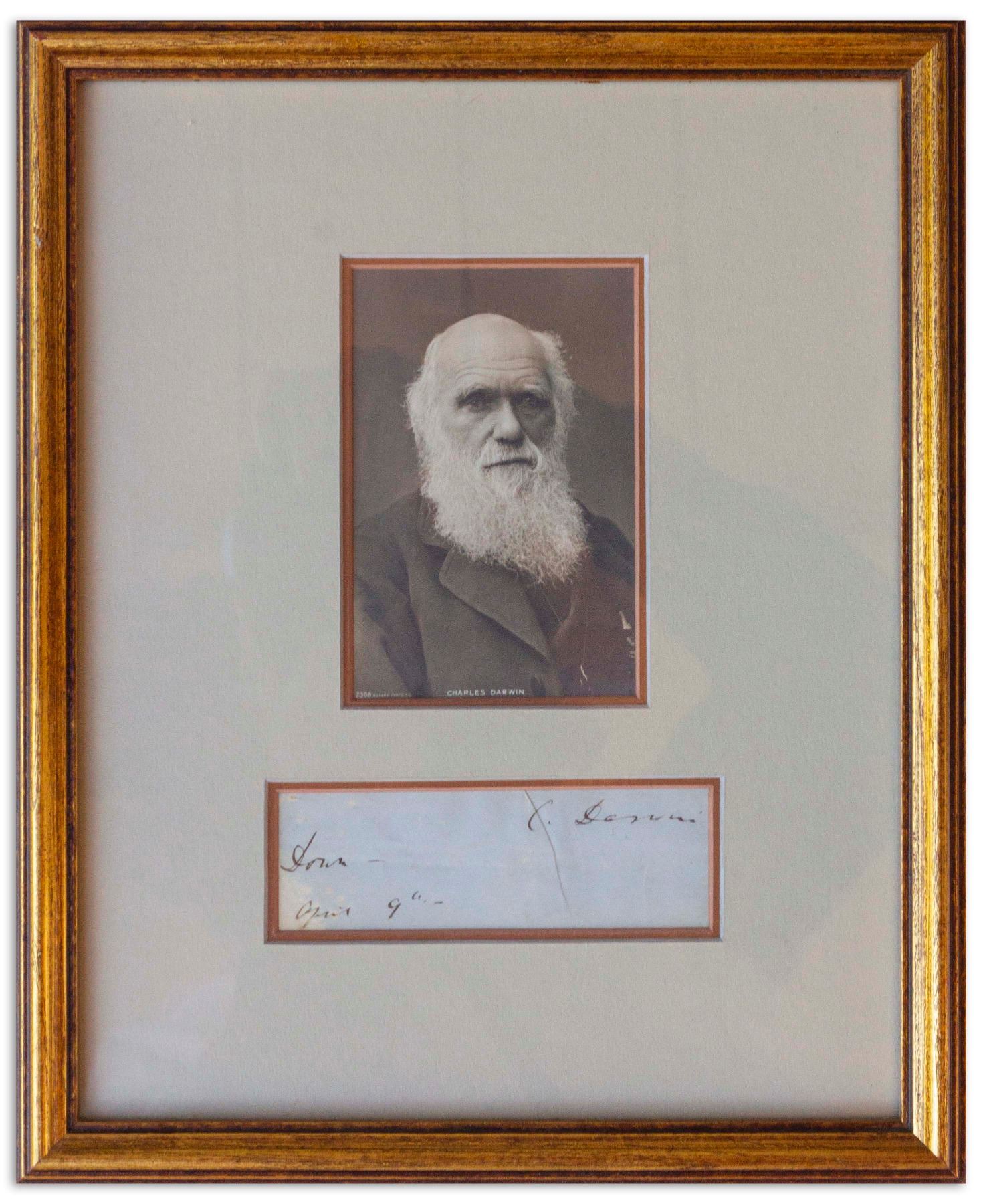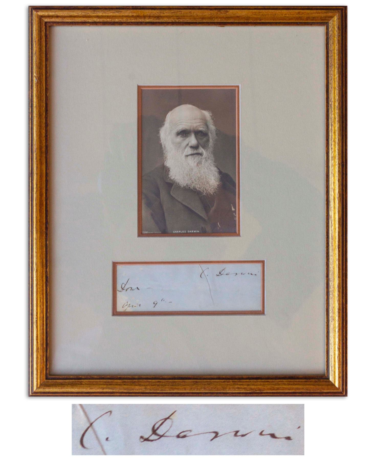Charles Darwin signature on a slip, signed ''C. Darwin'' from his home in Down on 9 April (no year). Slip measures approximately 4.75'' x 2'', framed with a photographic portrait of Darwin to a size of 10.5'' x 13''. Not examined out of frame, but appears very good.