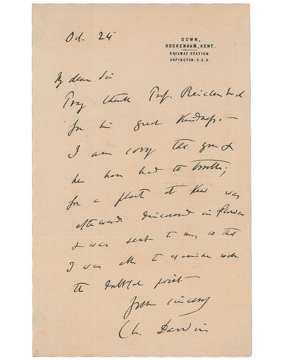 Desirable ALS signed “Ch. Darwin,” one page, 5 x 8, Down, Beckenham, Kent letterhead, October 24. Letter to an unidentified gentleman. In full: “Pray thank Prof. Reichenbach for his great kindness. l am sorry that you & he have had to trouble; for a plant at Kew was afterwards discovered in flower 815 was sent to me, so that I was able to examine well the doubtful point.” In fine condition, with intersecting folds, and a few diagonal creases under signature.