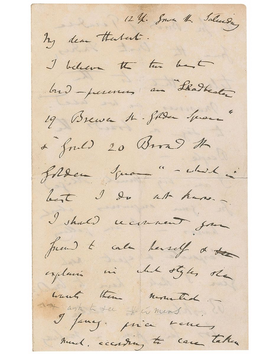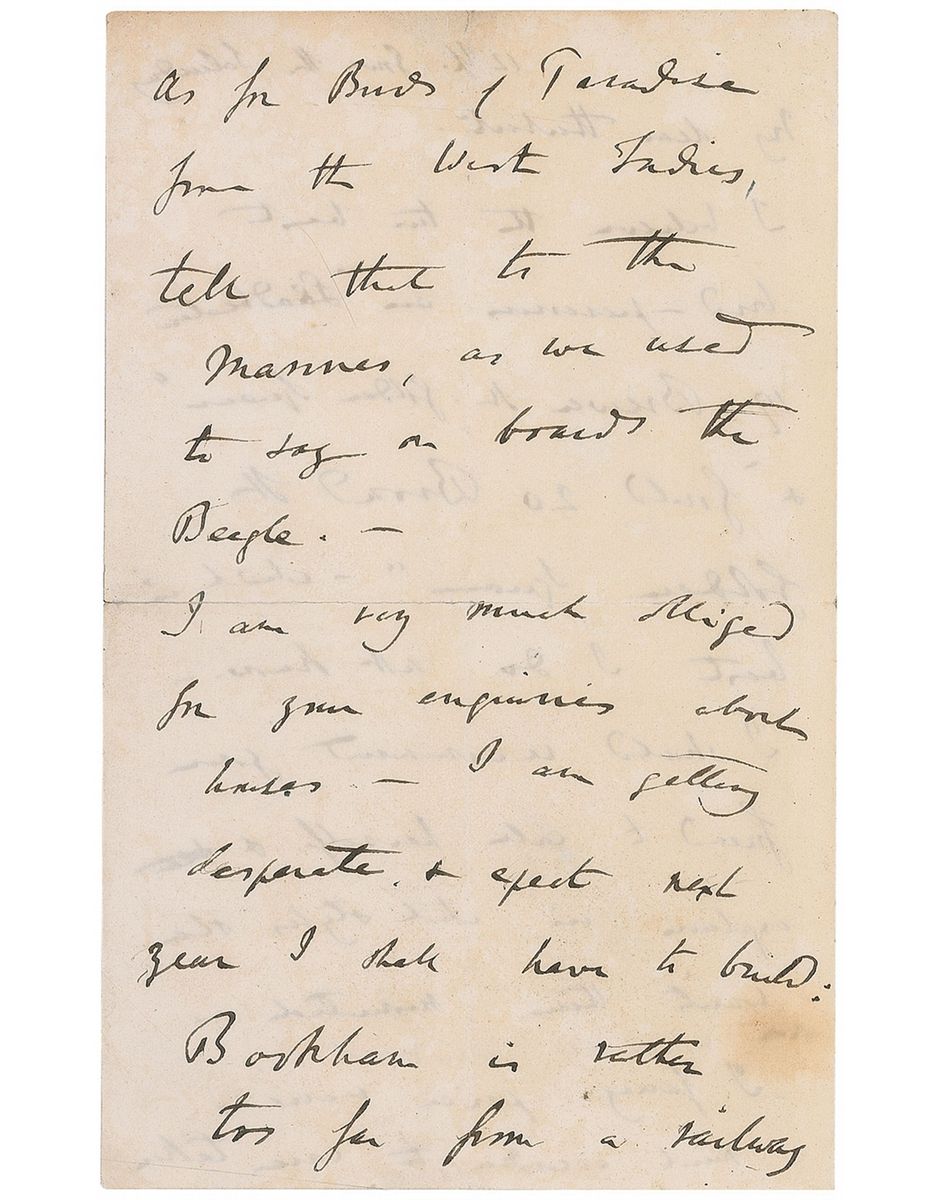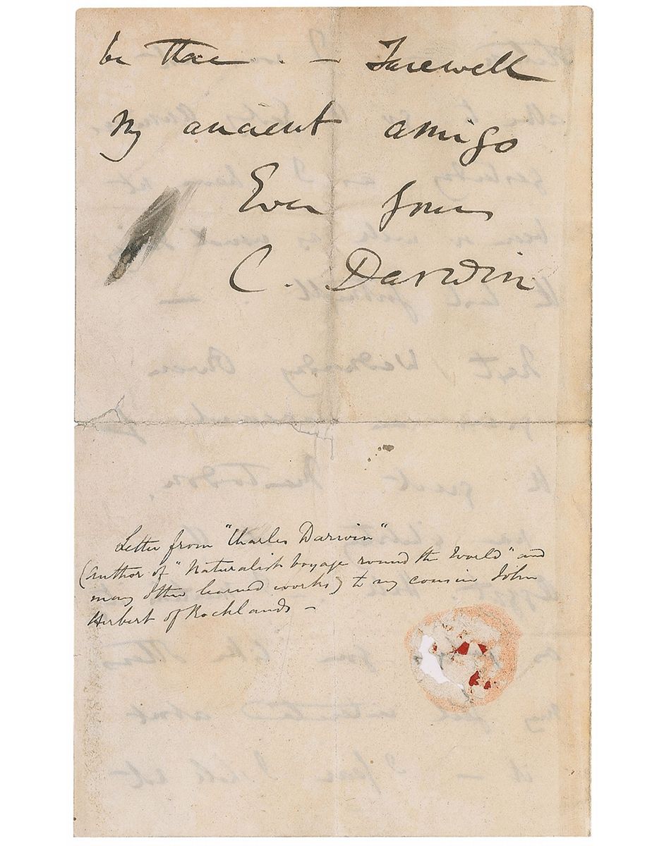 Very scarce ALS signed “Farewell my ancient amigo. Ever yours, C. Darwin,” four pages on two adjoining sheets, 4.5 x 7.5, no date (circa 1842). Letter to John Maurice Herbert. In full: “I believe that the two best bird-preservers are ‘Leadbeater, 19 Brewer St. Golden Square,’ and ‘Gould, 20 Broad Street, Golden Square’—which is best I do not know. I should recommend your friend to call herself and explain in which styles she wants them mounted—and ask to see specimens. I fancy price varies according to care taken. As for Birds of Paradise from the West Indies, tell that to the Marines, as we used to say on board the Beagle.