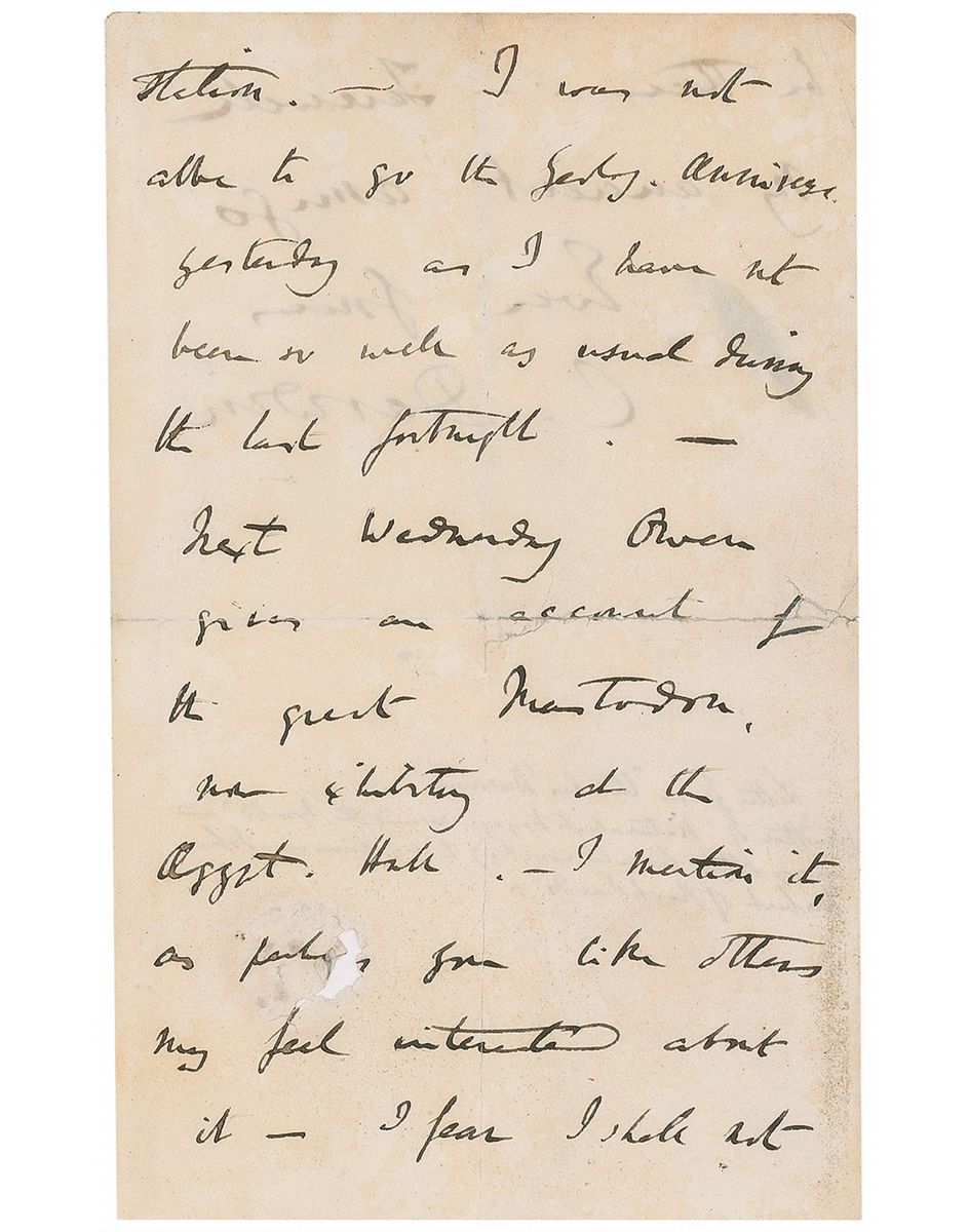 Next Wednesday, Owen gives an account of the great Mastodon now exhibiting at the Egypt. Hall. I mention it, as possibly you like others may feel interested about it. I fear I shall not be there.” Letter is docketed on the reverse of the second page by a relative of Herbert.
