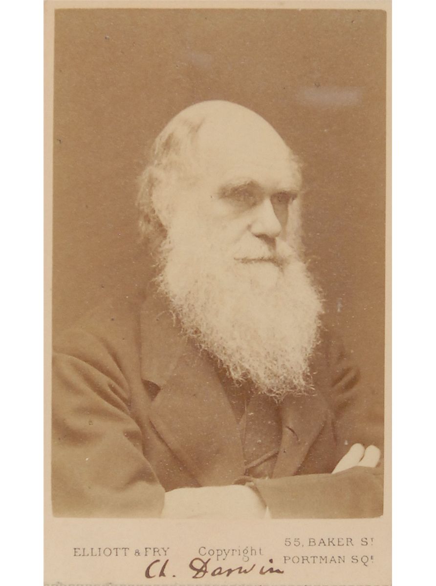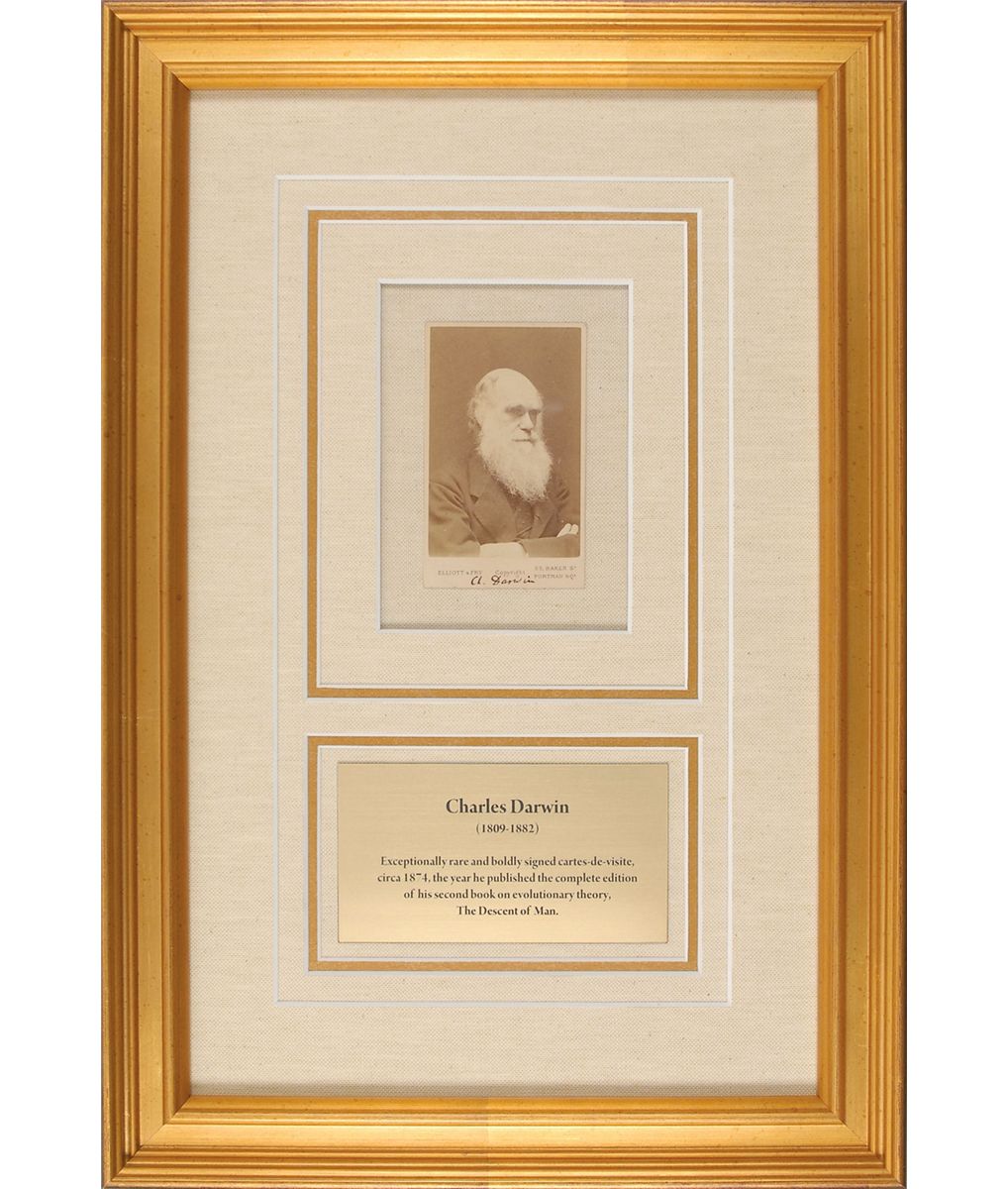 Vintage 2.5 x 4 carte-de-visite portrait of Darwin by Elliott & Fry, circa 1874, signed below the image in black ink, “Ch. Darwin.” Printed text on the reverse reads: “Elliot & Fry, 55, Baker Street, Portman Square. W.” Attractively archivally triple-cloth-matted and framed with a descriptive plaque to an overall size of 12 x 17.5. In fine condition, with subtle silvering to darker areas of the image, a couple of trivial corner tip dings, and some light mounting remnants to the reverse; all of these flaws are mentioned for the strictest of accuracy and in no way detract from the essentially pristine image quality. In 1874, Darwin published the second—and finally complete—edition of his second book on evolutionary theory, The Descent of Man. This exceptionally rare pose features Darwin with his arms crossed—cartes-de-visite typically seen from this sitting with Elliott & Fry are a slightly different pose where his arms are not visible. This is a perfect example of one of only a handful of known signed Darwin cartes-de-visite.