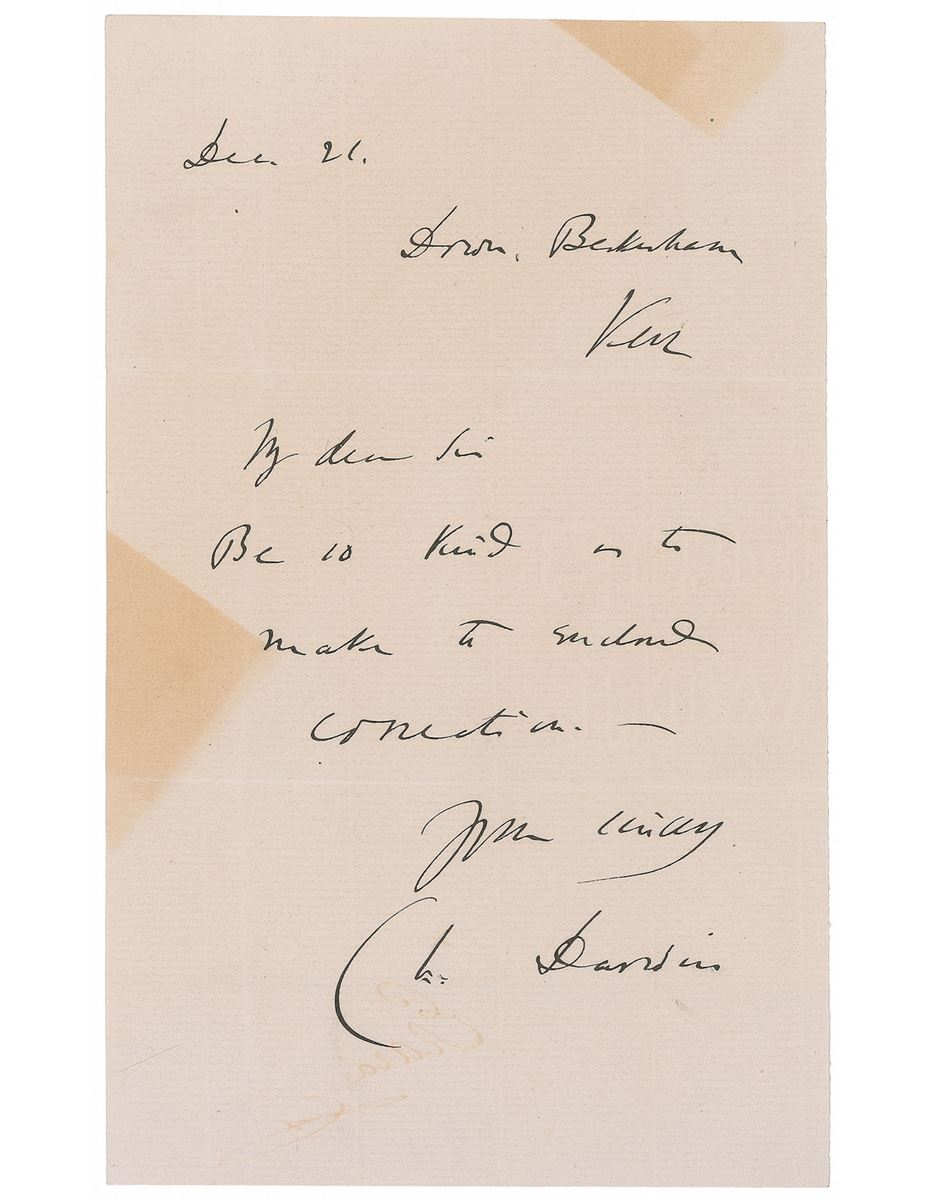 ALS signed “Ch. Darwin,” one page, 5 x 8, December 21, no date. Letter to a gentleman, presumably a printer or publisher. In full: “Be so kind as to make the enclosed correction.” In fine condition, with intersecting folds, two blocks of toning to margins, and light ink transfer below the signature from an unrelated letter once laid on top. A boldly penned letter boasting an especially large, prominent signature from the esteemed naturalist.