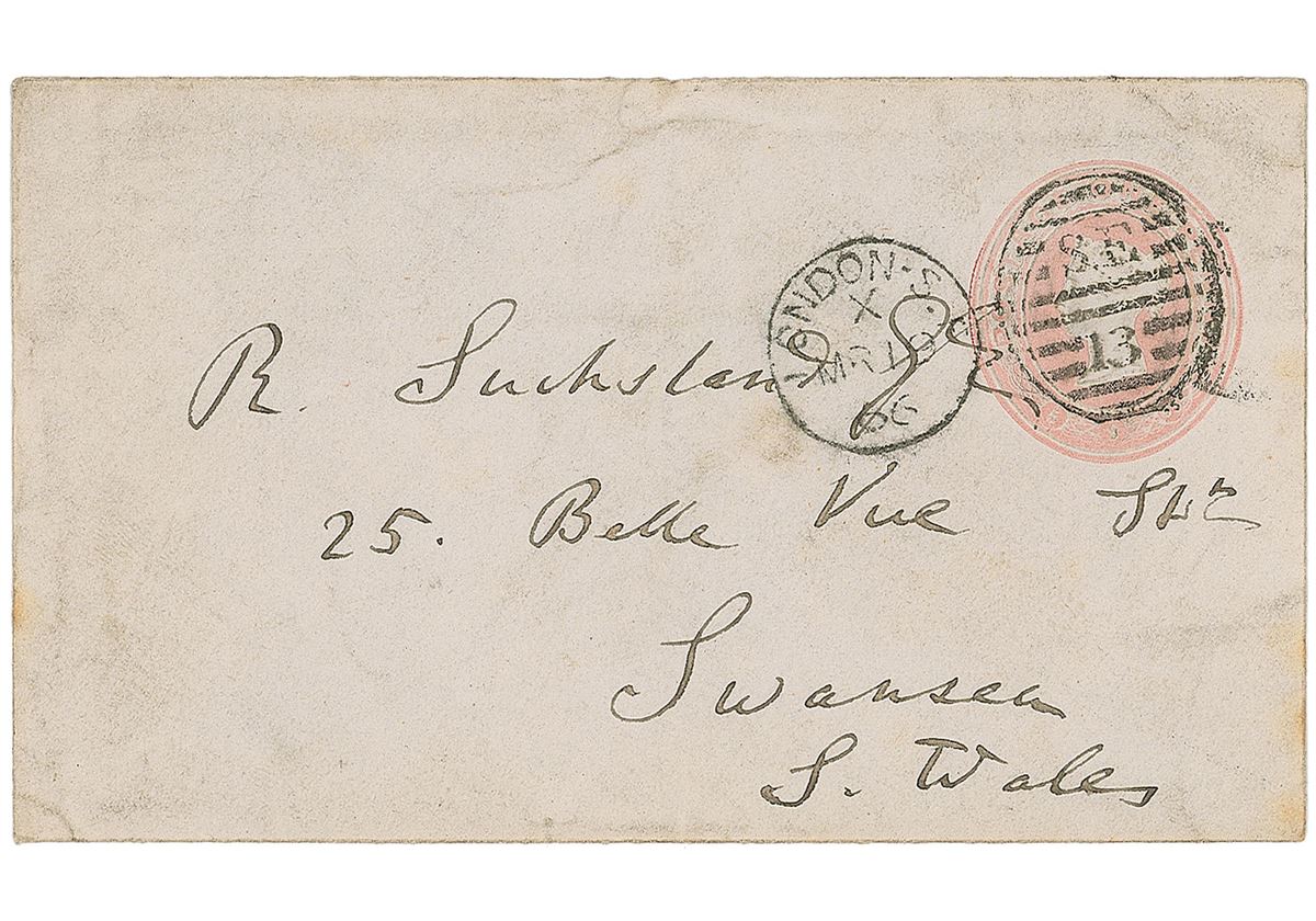 Hand-addressed mailing envelope, 4.75 x 2.75, addressed by Darwin to “R. Suchsland, 25 Belle Vue St., Swansea, S. Wales.” Postmarked at London, March 19, 1866. In very good condition, with overall creasing and soiling.