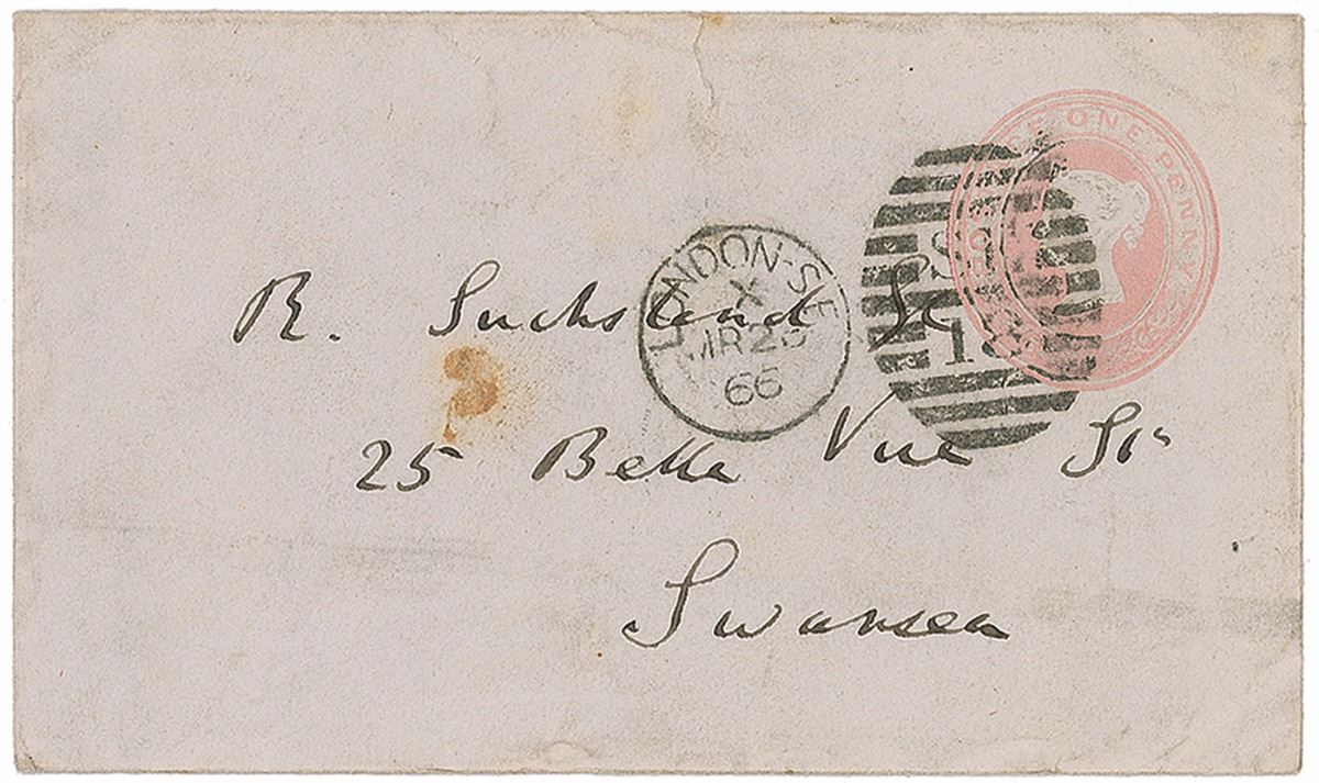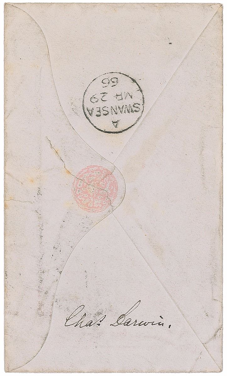 Hand-addressed mailing envelope, 4.75 x 2.75, addressed by Darwin to “R. Suchsland, 25 Belle Vue St., Swansea, S. Wales.” Postmarked at London, March 26, 1866. In very good condition, with scattered soiling, a small stain to the address area, and a tiny tear to the top edge.