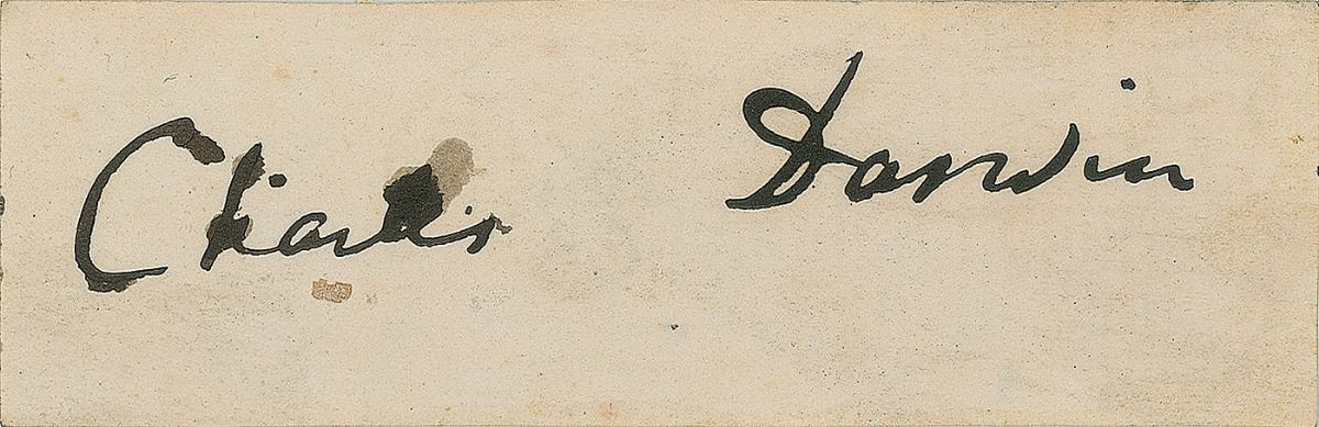 Sought-after ink signature, “Charles Darwin,” on an off-white 3.75 x 1 slip. In very good to fine condition, with light show-through from old mounting remnants on the reverse.