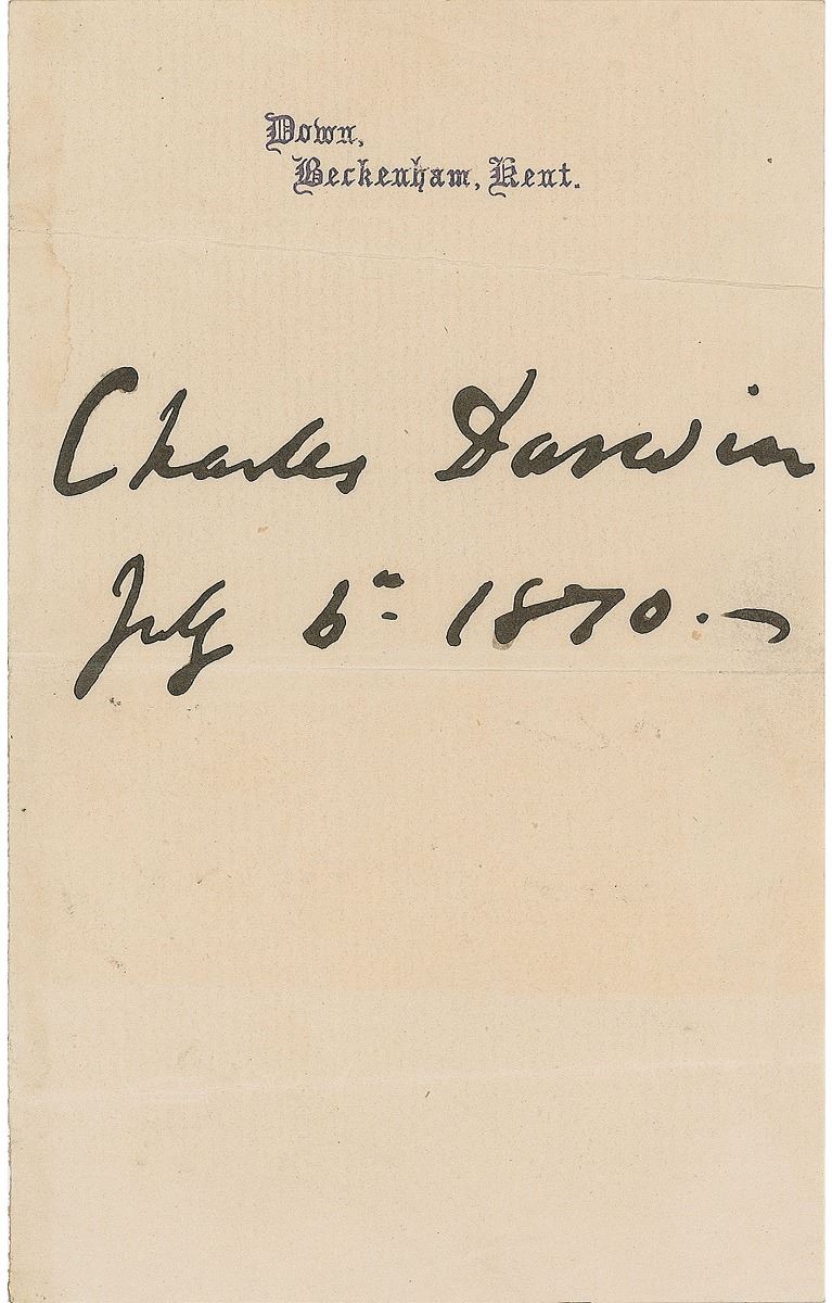 Extremely bold ink signature, “Charles Darwin, July 6th 1870,” on an off-white 3.25 x 5.5 sheet of Down, Beckenham, Kent letterhead. In very good to fine condition, with faint staining to trimmed edges and several moderate horizontal folds. Although Darwin had published On the Origin of Species in 1859, it was not until 1871’s The Descent of Man—released one year after this signature—that he first used the word ‘evolution.’