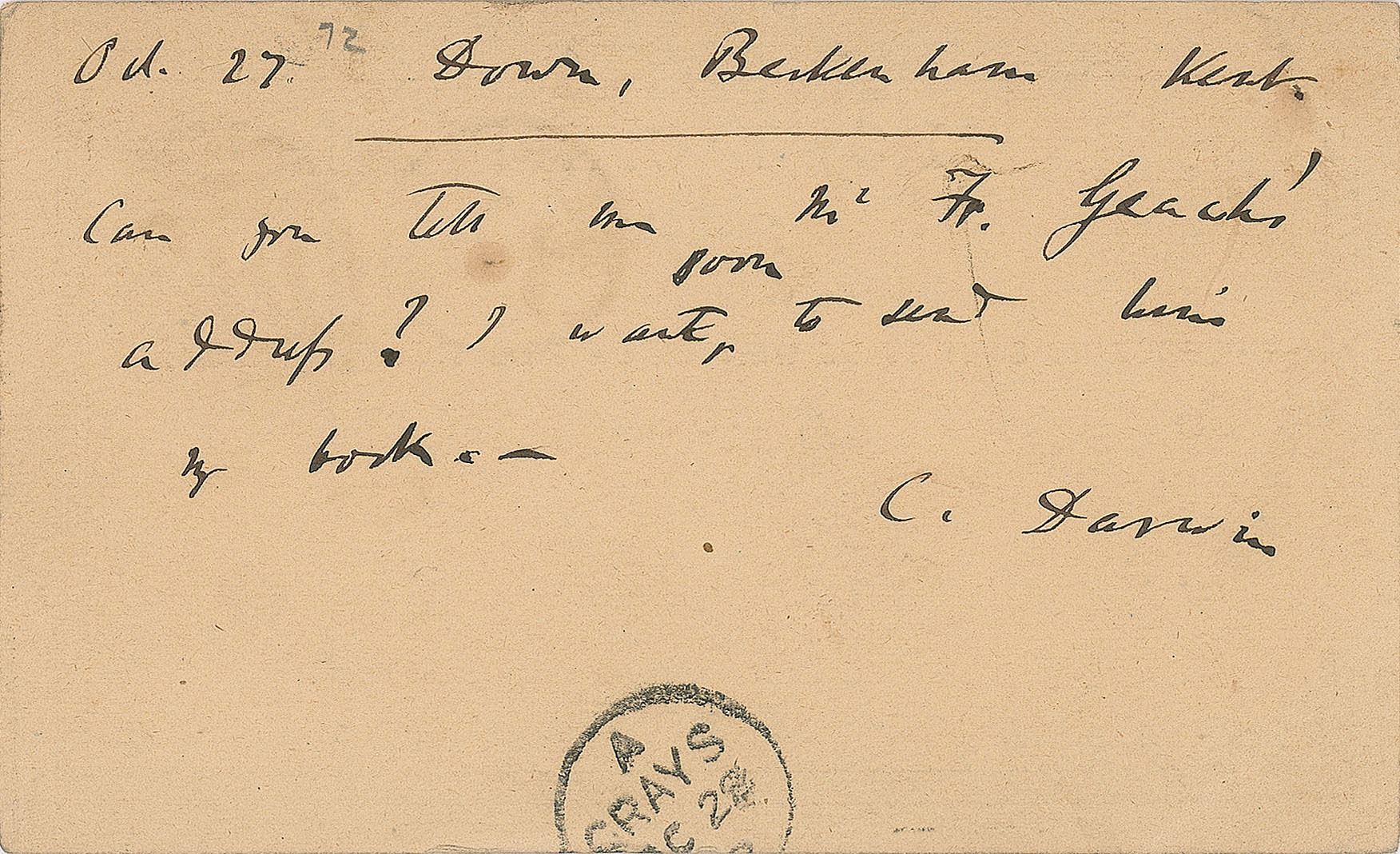 Desirable ANS signed “C. Darwin,” one page on a 4.75 x 3 postcard, postmarked October 27, 1872. Written from his Down House in Beckenham, Kent, a brief note to fellow naturalist Alfred Russel Wallace, in full: "Can you tell me Mr. Fr. Geach’s address? I want to send him my book—." Darwin adds the address on the reverse in his own hand. In fine condition.