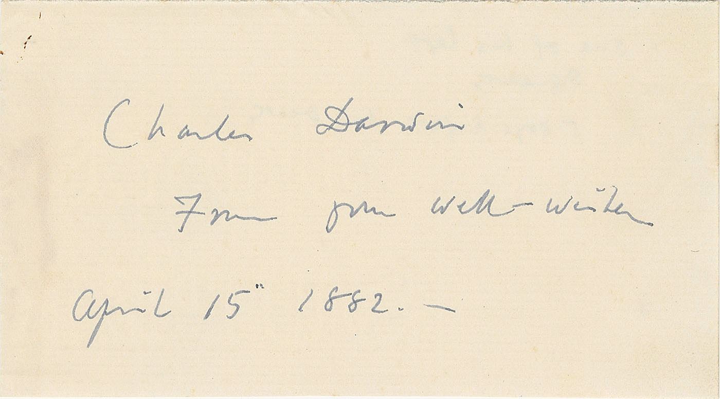 Extremely desirable ink signature, "Charles Darwin, from your well-wisher, April 15, 1882,” on an off-white 5 x 2.75 slip. In fine condition, with light show-through along the left edge from mounting traces on the reverse. Darwin would pass away just four days later on April 19, 1882.