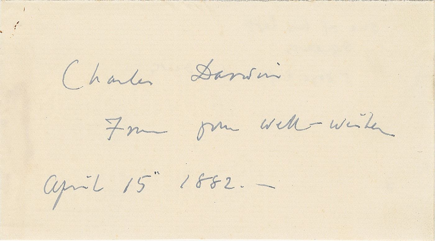 Extremely desirable ink signature, "Charles Darwin, from your well-wisher, April 15, 1882,” on an off-white 5 x 2.75 slip. In fine condition, with light show-through along the left edge from mounting traces on the reverse. Darwin would pass away just four days later on April 19, 1882.