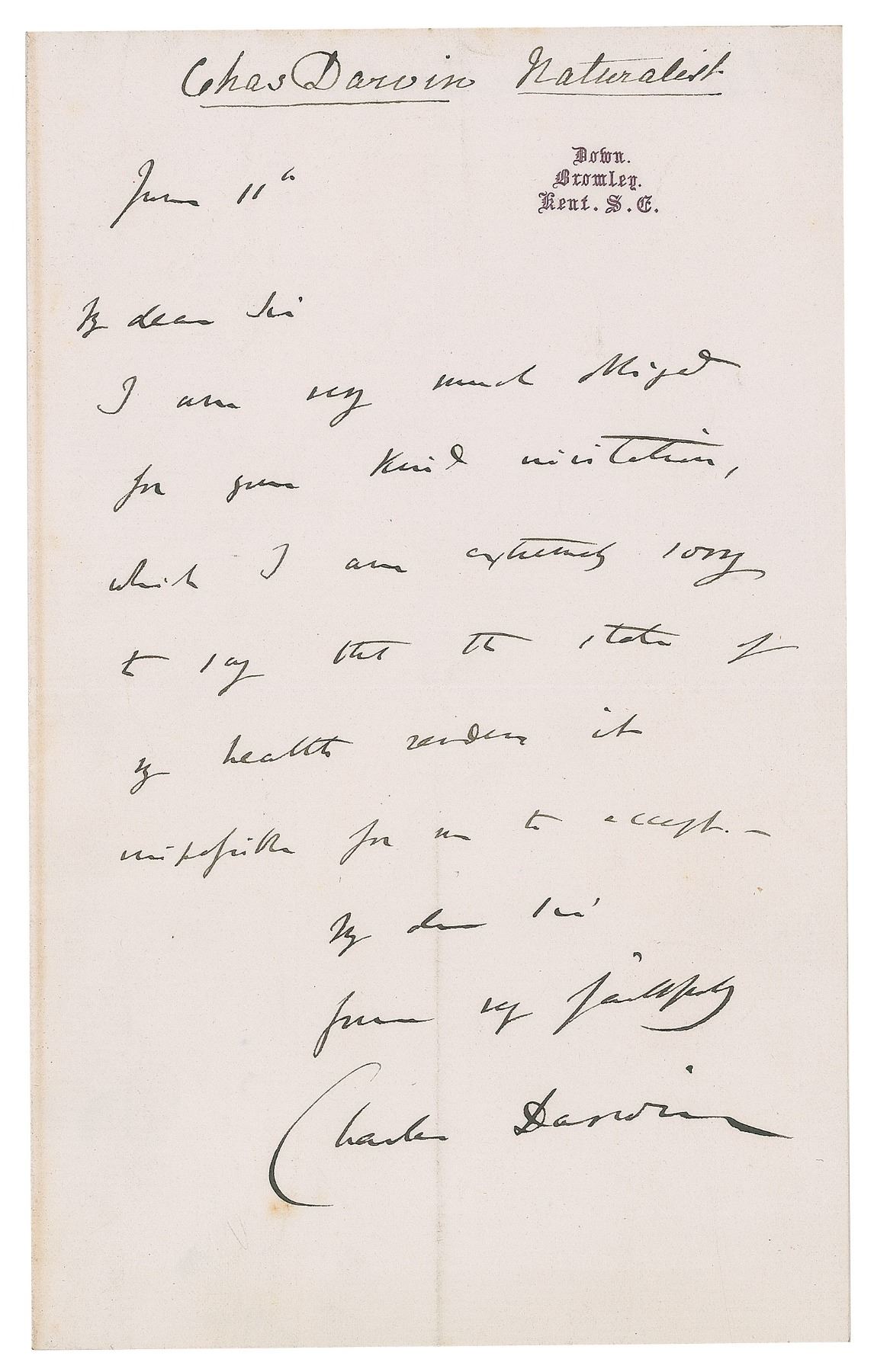 ALS signed “Charles Darwin,” one page, 5 x 8, personal Down House letterhead, June 11, [no year]. Letter to Henry Nottidge Moseley, a British naturalist who sailed on the global scientific expedition of HMS Challenger, in full: "I am very much obliged for your kind invitation, which I am extremely sorry to say that the state of my health renders it impossible for me to accept." In fine condition, with intersecting folds.