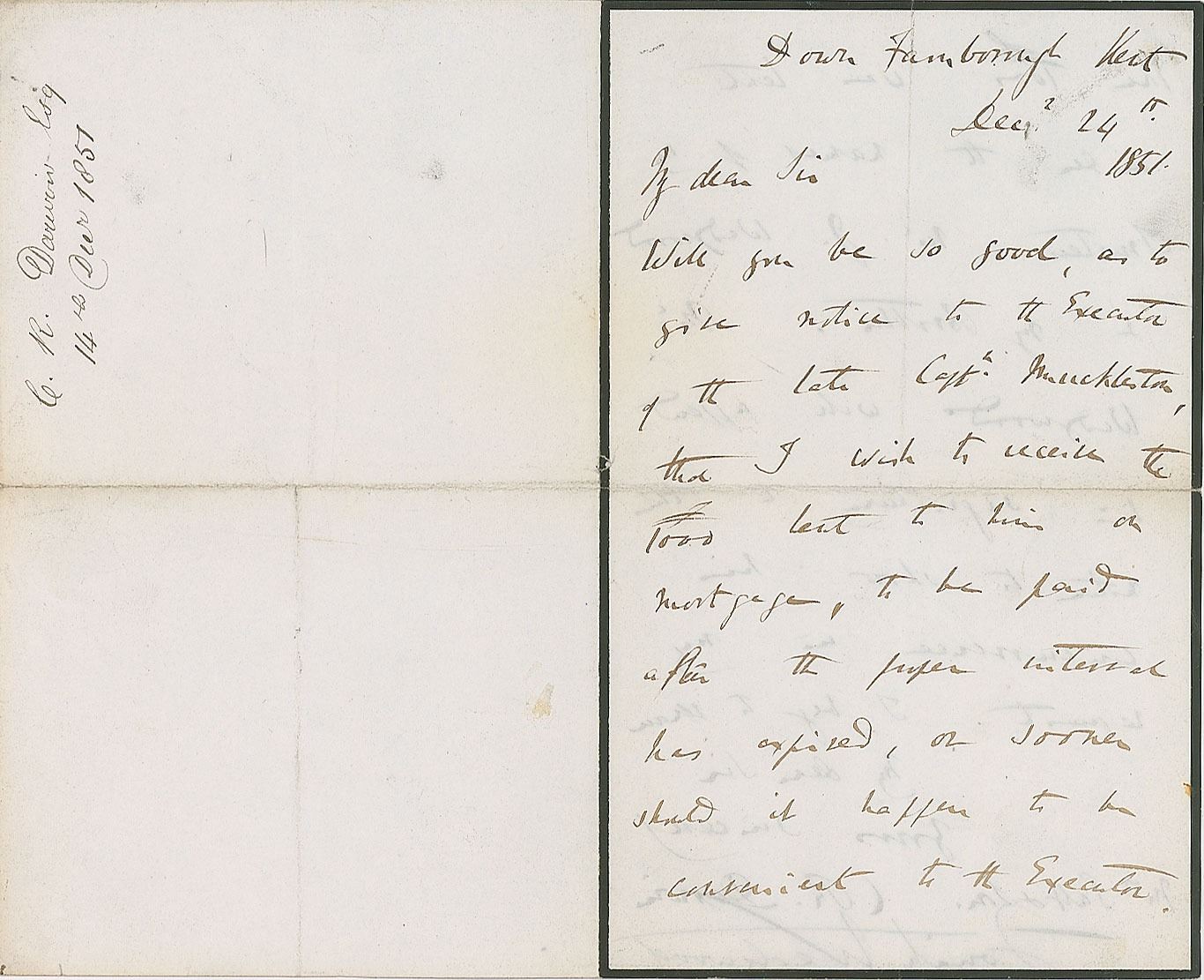 ALS signed “C. R. Darwin,” both sides of a black-bordered 4.25 x 7 page, December 24, 1851. Written from his home in Down Farnborough, Kent, Darwin writes to his lawyer and financial advisor, Thomas Salt, in full: "Will you be so good, as to give notice to the Executor of the late Capt'n. Muckleston, that I wish to receive the £1000 lent to him on mortgage, to be paid after the proper interval has expired, or sooner should it happen to be convenient to the Executor. The £1000 was lent under the names of my Trustees Mr. J. Wedgwood & my Brother. Mr. Wedgwood will append his signature to this note to show his concurrence in my request." Josiah Wedgewood, Darwin's grandfather, had added his signature below. In fine condition, with intersecting folds.
