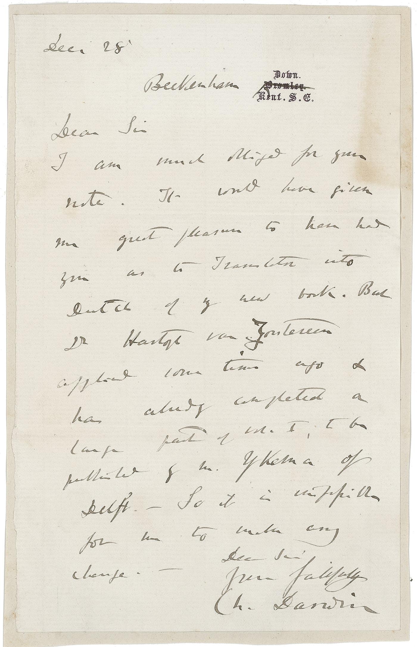 English naturalist and author (1809–1882) whose book explaining his theories of evolution, On the Origin of the Species by Means of Natural Selection (1859), takes a place among the most influential texts in the history of scientific thought. ALS signed “Ch. Darwin,” one page, 5 x 8, personal letterhead, December 28, [1870]. Letter to an unidentified gentleman. In part: “I am much obliged for your note. It would have given me great pleasure to have had you as the translator into Dutch of my new book. But Dr. Hartogh van Zouteveen offered some time ago & has already completed a large part of Vol. I to be published…so it is impossible from me to make any change.” Letter is affixed to a slightly larger off-white sheet. Light block of toning to top right, a few other areas of trivial toning, and some light wrinkling and rippling from adhesive on reverse, otherwise fine condition. Originally offered at Christie’s and accompanied by the original auction sleeve.