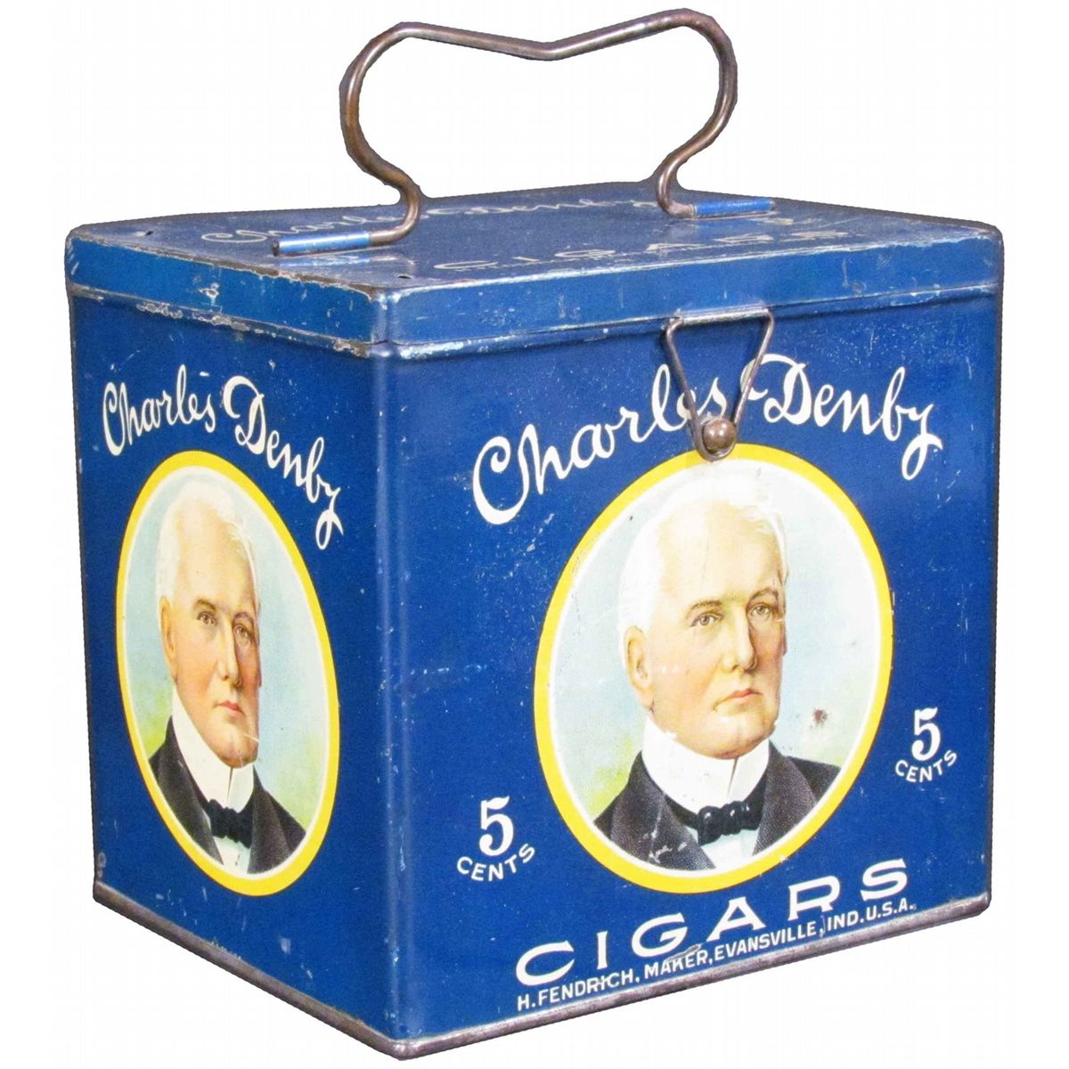 Charles Denby Cigars Lunch Pail Tin. Residue from tax stamp on top and side and light scratches otherwise good condition. 6 X 6 X 5 inches.