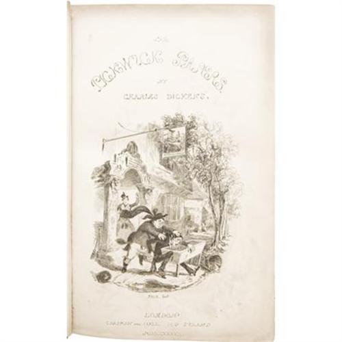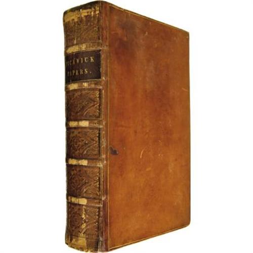 <B>Charles Dickens: <I>The Posthumous Papers of the Pickwick Club</B></I></B></I> (London: Chapman and Hall, 1837), first edition, second issue, 609 pages, modern full leather binding with gilt spine titles and decorative blind-stamped flourish, 8vo (5.5" x 8.5"). Marbled endpapers and edges. Illustrated by R. Seymour and Phiz. This copy has all the of the textual first issue points except for the rare one on page 25: the signature "E" is present at the bottom. The first issue points present include: "hodling" on page 260, line 29; the figure "7" is aligned above the other page numbers on page 267; correct readings of "inde- licate" and "inscription" on page 341; uncorrected "S. Veller" on page 342 line 5; the "F" in the headline of page 432 is imperfect. In addition, the engraved title page is in the first state, with the signpost reading "Veller" instead of "Weller". Pages 25 and 27 have the signature "E" at the bottom, consistent with the second issue. The book is in very good condition, with moderate shelf wear, mild toning to the pages with engravings, and a missing half title page. A handsome early edition of Dickens' <I>Pickwick Papers</B></I>.<BR><BR><b>Shipping:</b> Books & Catalogs (<a target="_blank" href="http://www.heritageauctions.com/common/shipping.php">view shipping information</a>)