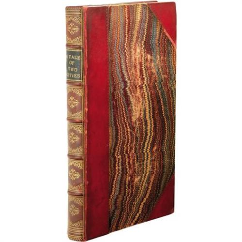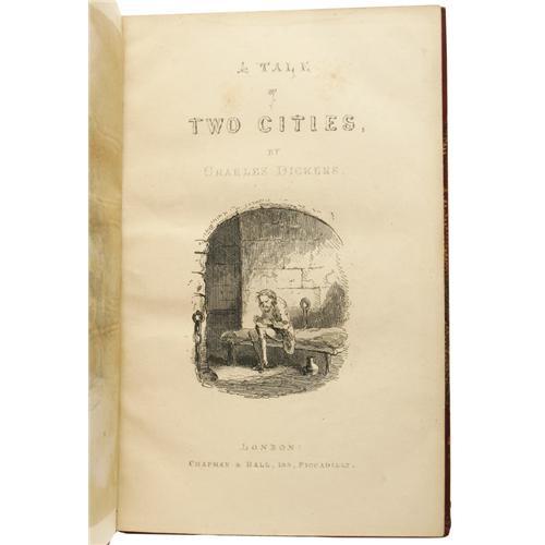 <B>Charles Dickens: <I>A Tale of Two Cities.</B></I></B></I> (London: Chapman and Hall, 1859), first edition, mixed state, with uncorrected "affetcionately" on line, page 134, corrected pagination on page 213, 254 pages, 16 etchings by H. K. Browne, half red calf binding with marbled boards, six spine compartments between raised bands, gilt-tooled ornamentation in five compartments, gilt titles, 8vo (5.75" x 8.5"), wear to external hinges, inside front hinge cracked, facsimile Dickens centenary stamp on inside front cover, minor wear to marbled boards, else fine.<BR><BR><b>Shipping:</b> Books & Catalogs (<a target="_blank" href="http://www.heritageauctions.com/common/shipping.php">view shipping information</a>)