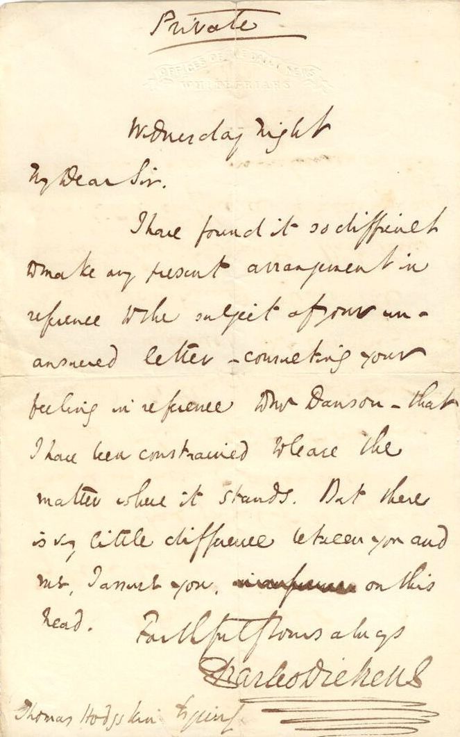 Charles Dickens hand written and signed letter with original period CDV photo of Dickens. This handwritten and signed letter with Dickens' distinctive signature features his usual elaborate paraph. It is marked private on top. Labeled Wednesday night it is believed this letter is from Dickens when he was the editor of the Daily News a paper her started in about 1845. The letter is a little cryptic but does refer to a letter and situation with a Mr. Danson and Thomas Hodgskin one of his writers who he recruited for his newly formed Newspaper. This letter might relate to a specific situation where Hodgskin felt undermined by his editor Dickens, when he passed over for a leader column by another editor a John Towne Danson the financial editor, based on this and other clashes, Dickens did give up his role as editor shortly thereafter.