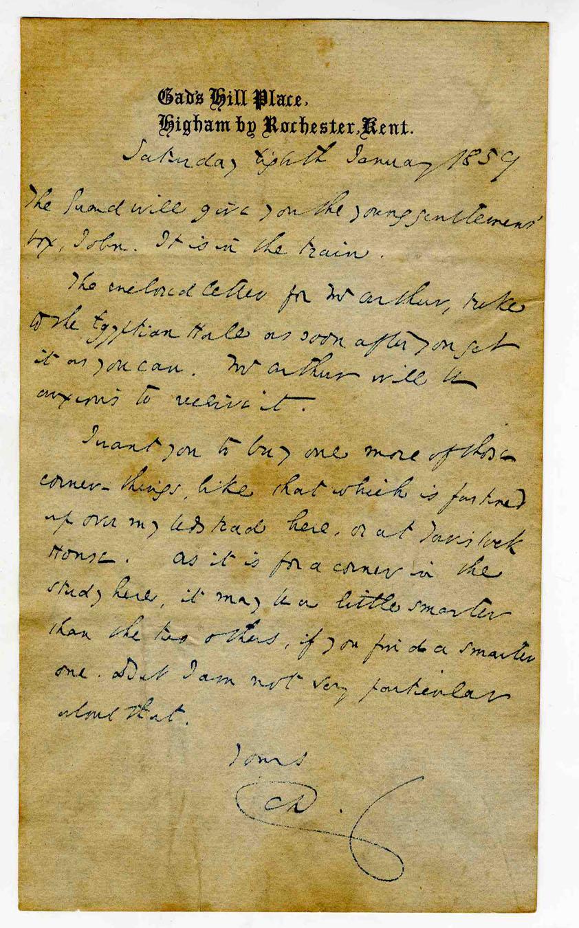 Unique Charles Dickens autograph letter signed on ''Gad's Hill Place / Higham by Rochester Kent'' stationery, dated 8 January 1859. Instructional letter to servant John Thompson reads in part: ''…I want you to buy one more of these corner-things, like that which is fastened up over my bedstead here, or at Tavistock House…'' Letter, measuring 4.25'' x 7'', is accompanied by a 5'' x 7'' black and white photograph of Dickens seated at his writing desk. Letter has expected age-staining and foxing, else very good condition.