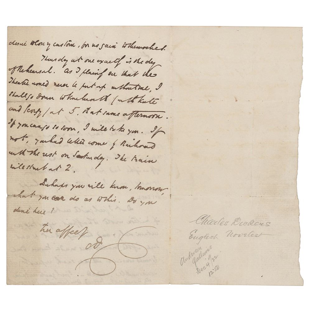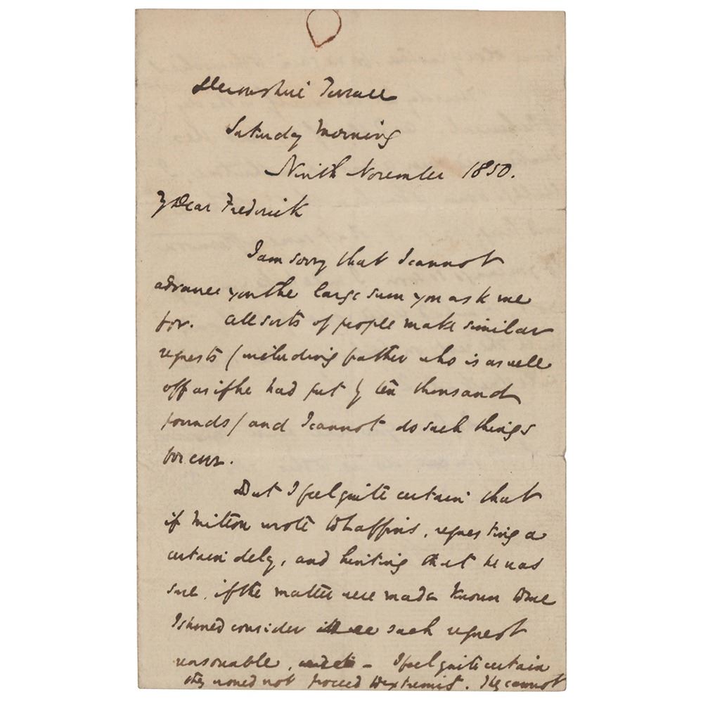 ALS signed “C.D.,†one page both sides, 4.5 x 7, November 9, 1850. Handwritten letter to his younger brother, Frederick Dickens, in part: "I am sorry that I cannot advance you the large sum you ask me for. All sorts of people make similar requests (including father who is as well off as if he had put by ten thousand pounds) and I cannot do such things forever. But I feel quite certain that if Milton wrote to Laffins, requesting a certain delay, and hinting that he was sure, if the matter were made known to me, I should consider such request reasonable…Thursday at one exactly is the day of the Rehearsal. As I plainly see that the Theatre could never be put up without me, I shall go down…at 5 that same afternoon. If you can go so soon, I will take you." In very good to fine condition, with a small rusty paperclip impression to the top of the first page, light toning to the edge of the second page, and trimming to the blank integral address leaf.