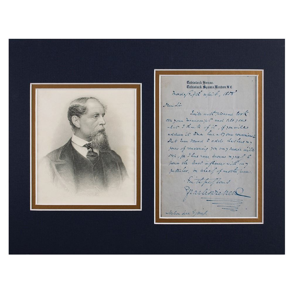 ALS, one page, 4.5 x 6.5, Tavistock House letterhead, April 5, 1858. Handwritten letter to Nelson Lee, agreeing to look over his manuscript. In full: "I will with pleasure look over your manuscript and tell you what I think of it, if you will address it to me here at your convenience. But I am bound. to add that here my power of rendering you any service will stop, for I have never known myself to possess the least influence with any publisher, on behalf of another person." Attractively double-matted with an engraved portrait to an overall size of 13 x 10. In fine condition. Accompanied by a full letter of authenticity from JSA. Tavistock House was the London home of Charles Dickens and his family from 1851 to 1860, and where he wrote Bleak House, Hard Times, Little Dorrit, and A Tale of Two Cities. A desirable literary letter from one of the 19th century's foremost authors.