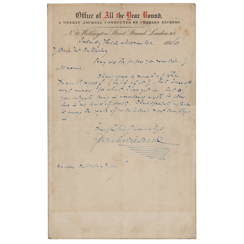 ALS, one page, 5 x 8, Office of All the Year Round letterhead, November 3, 1866. Handwritten letter to Scottish journalist and dramatist Andrew Halliday, in full: "Pray do the paper you mention, by all means. I have done so much of the Xmas N:o myself (half of it), that I cannot as yet answer for what I can get in. But of your subject's being in accordance with the plans, there is no kind of doubt. I have specially noted it among the mass of contributions now tumbling in." In very good to fine condition, with some soiling, light overall creasing, and toning from prior display.