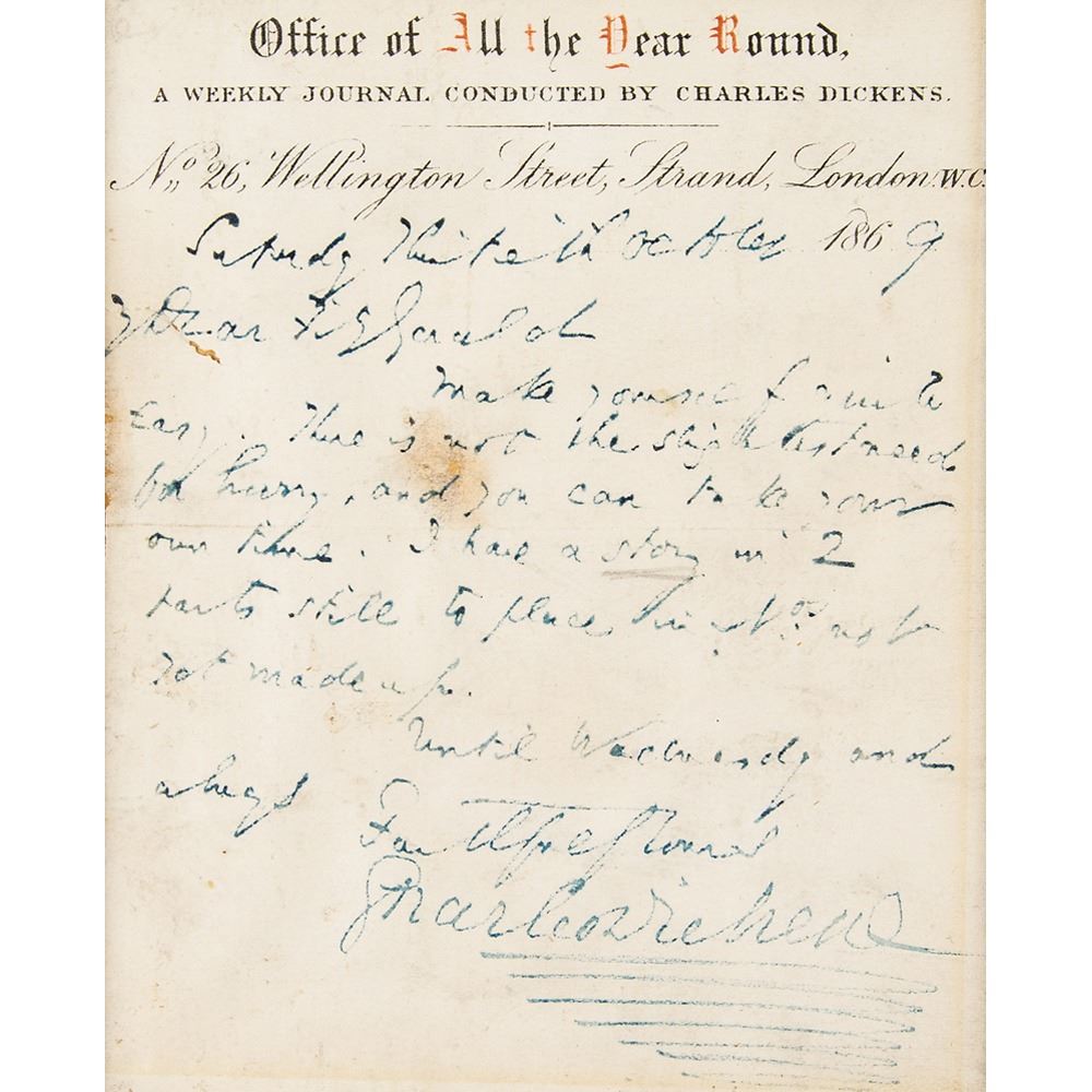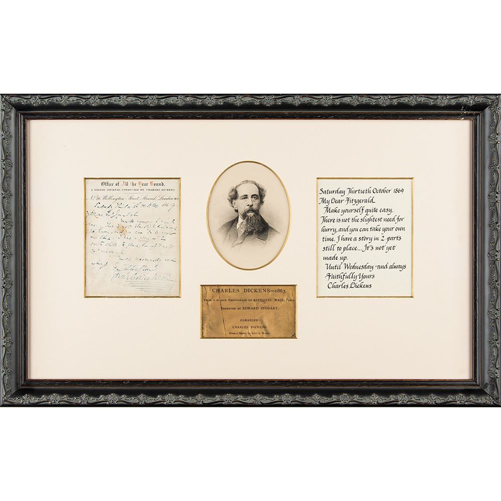 ALS, one page, 3.75 x 4.75, Office of All the Year Round letterhead, October 30, 1869. Handwritten letter to "Fitzgerald," in part: "Make yourself quite easy. There is not the slightest need for hurry, and you can take your own time. I have a story in 2 parts still to place in No.'s not made up." Matted and framed with a portrait and calligraphic transcript to an overall size of 19.75 x 12.25. In very good condition, with creasing, soiling, and wrinkling.