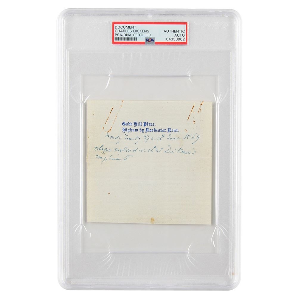 ANS signed “Mr. Dickens,†one page, 4.25 x 4.25, Gad's Hill Place letterhead, June 28, 1869. Handwritten note by Charles Dickens, in full: "Cheque enclosed with Mr. Dickens's compliments." In fine condition, with two rusty paperclip impressions to the top edge. Encapsulated in a PSA/DNA authentication holder.