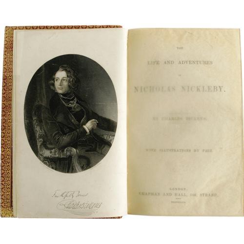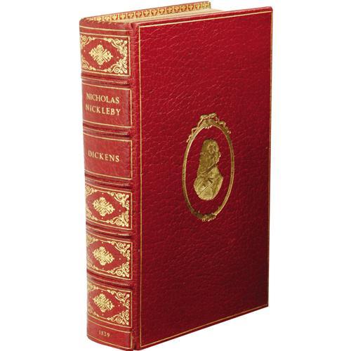 <B>Charles Dickens:<I> The Life and Adventures of Nicholas Nickleby.</B></I></B></I> (London: Chapman and Hall, 1839), first edition, mixed state with half title and list of plates, "visiter" corrected to "sister" on page 123 but "latter" for "letter" still present on page 160, 624 pages, 39 engraved plates by "Phiz.", engraved frontis, full red morocco binding, six spine compartments between raised bands, gilt-tooled ornamentation in four compartments, gilt-ruled borders on both boards, with gilt Charles Dickens portrait in gilt frame on the front board and "Charles Dickens" gilt-tooled in script on the back board, all page edges gilt, gilt dentelle, marbled endpapers, with small binder's stamp on inside front board reading: "Bayntun, Binder, Bath, Eng.", 8vo (5.25" x 8.25"), in superb condition.<BR><BR><b>Shipping:</b> Books & Catalogs (<a target="_blank" href="http://www.heritageauctions.com/common/shipping.php">view shipping information</a>)