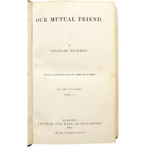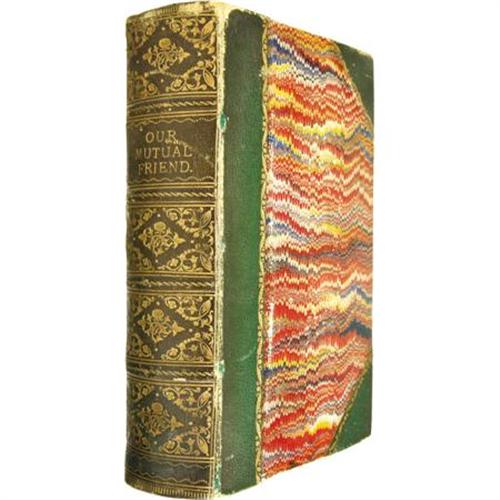 <B>Charles Dickens: <I>Our Mutual Friend</B></I></B></I> (London: Chapman and Hall, 1865), first edition, two volumes bound in one, 629 pages total, contemporary green half leather binding with marbled boards, gilt titles and decorative flourish on the spine, and leather bordered in gilt along inner edges, 8vo (5.5" x 8.25"). Illustrations by Marcus Stone. Marbled edges and endpapers. Plate at page 268 repaired. The book shows edge wear, spine fold wear, minor foxing at the endpapers, and tender inner hinges, else very good. An attractive one volume binding of an original Dickens classic.<BR><BR><b>Shipping:</b> Books & Catalogs (<a target="_blank" href="http://www.heritageauctions.com/common/shipping.php">view shipping information</a>)