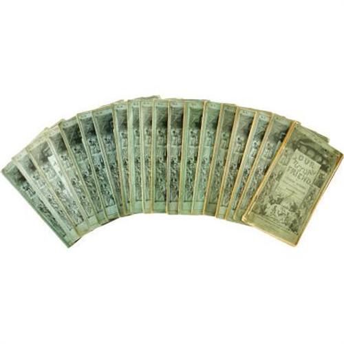 <B>Charles Dickens: Original Serialized First Edition of <I>Our Mutual Friend</B></I></B></I> (London: Chapman and Hall, May 1864 to November 1865), first edition, twenty parts in 19 volumes, various paginations, original blue-green illustrated wrappers, 8vo (5.25" x 8.5"), housed in a red cloth fold-over slipcase. Forty plates with illustrations by Marcus Stone, engraved by Dalziel and W. T. Green. Part 1 is in the first state, with no printer's imprint and the Fry's advertisement at rear reading "Homoepathic Cocoa" on yellow paper. Part 1 lacks the first leaf of advertisements and the ad for "Churchman's" at the rear. The most advertisement-heavy among Dickens' serialized works. The serialized first offering of Dicken's classic, overall in very good condition. Part 1 is slightly worn than the other installments, with a slightly faded cover. All display wear along the fore-edge, but are overall very attractive and rare in this condition. The slipcase has one detached edge held together with clear tape, and moderate soiling to the boards.<BR><BR><b>Shipping:</b> Books & Catalogs (<a target="_blank" href="http://www.heritageauctions.com/common/shipping.php">view shipping information</a>)