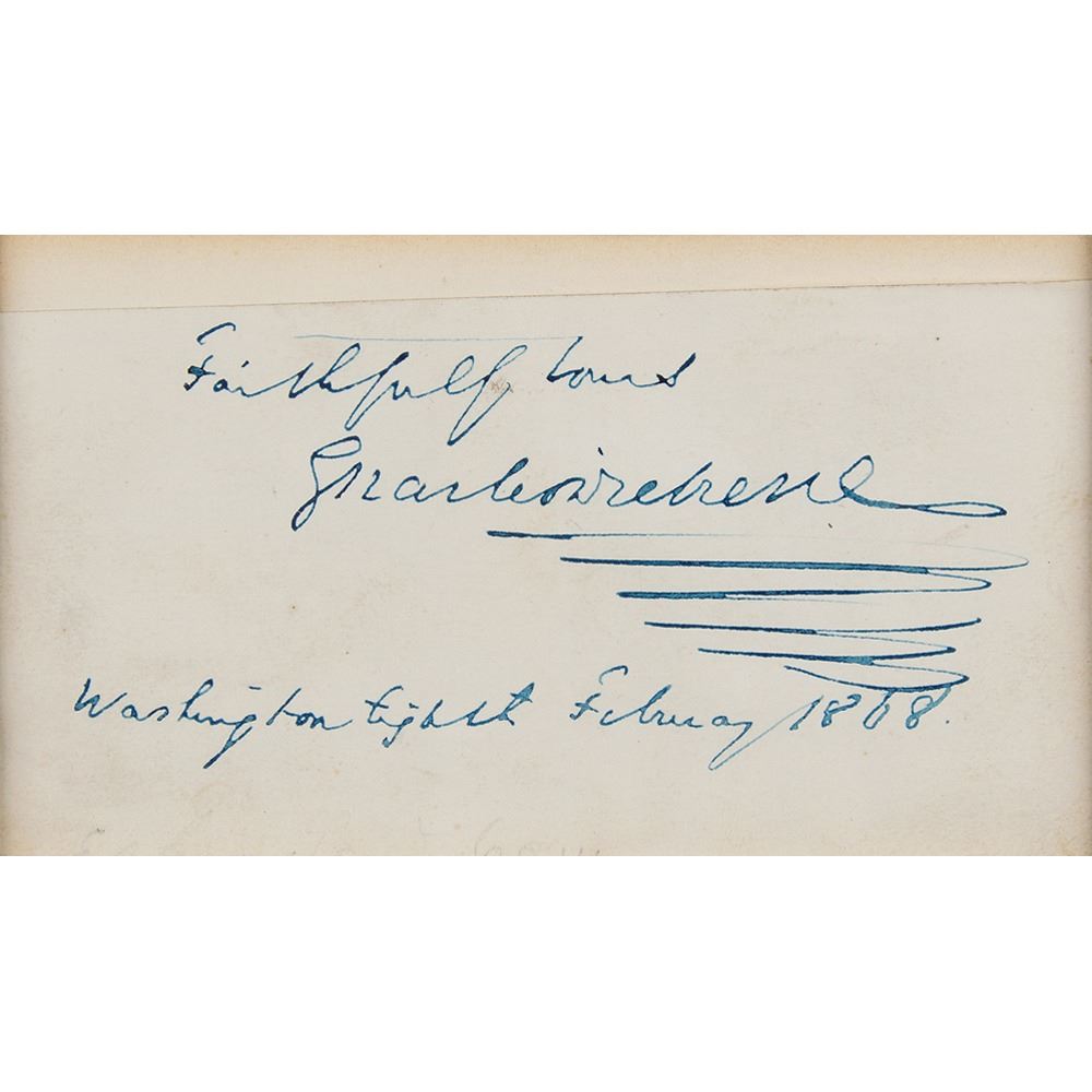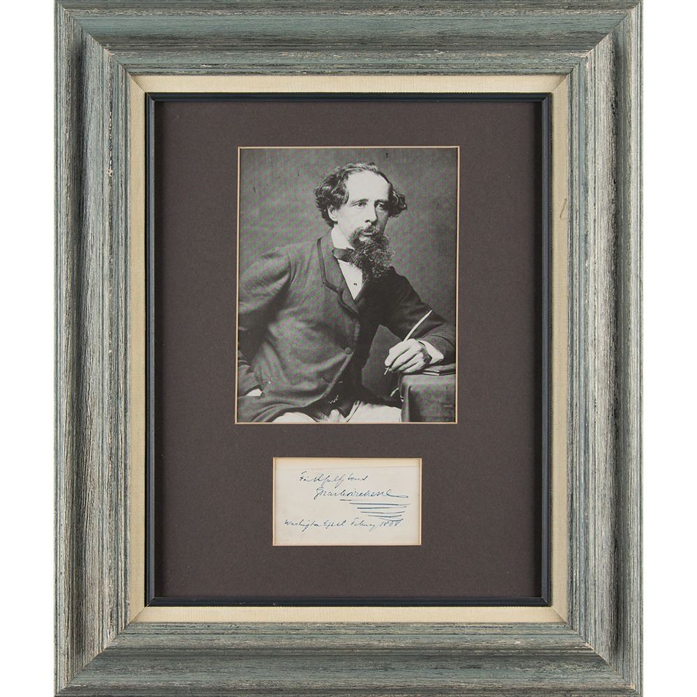 Ink signature, "Faithfully yours, Charles Dickens, Washington, Eighth February 1868,” on an off-white 4 x 2.25 slip. Archivally matted and framed with a portrait of the author to an overall size of 16.25 x 16.25. In fine condition, with a trimmed top edge.