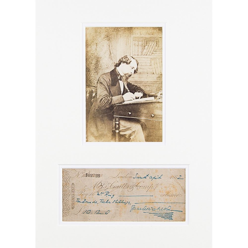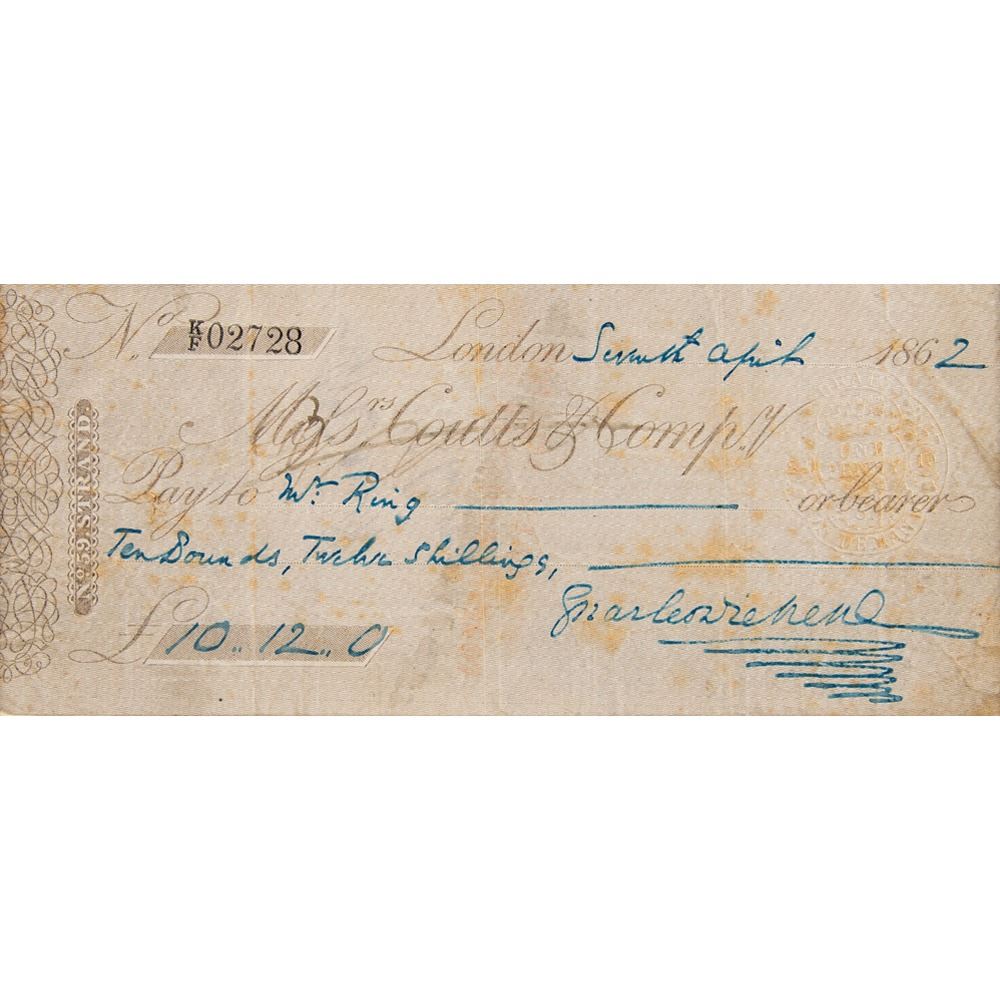 Coutts & Company bank check, 7 x 3, filled out and signed by Charles Dickens, payable to Ms. Ring for £10.12, April 7, 1862. Double-matted with a photo to an overall size of 10.25 x 14. 5. In very good to fine condition, with scattered creasing and staining.