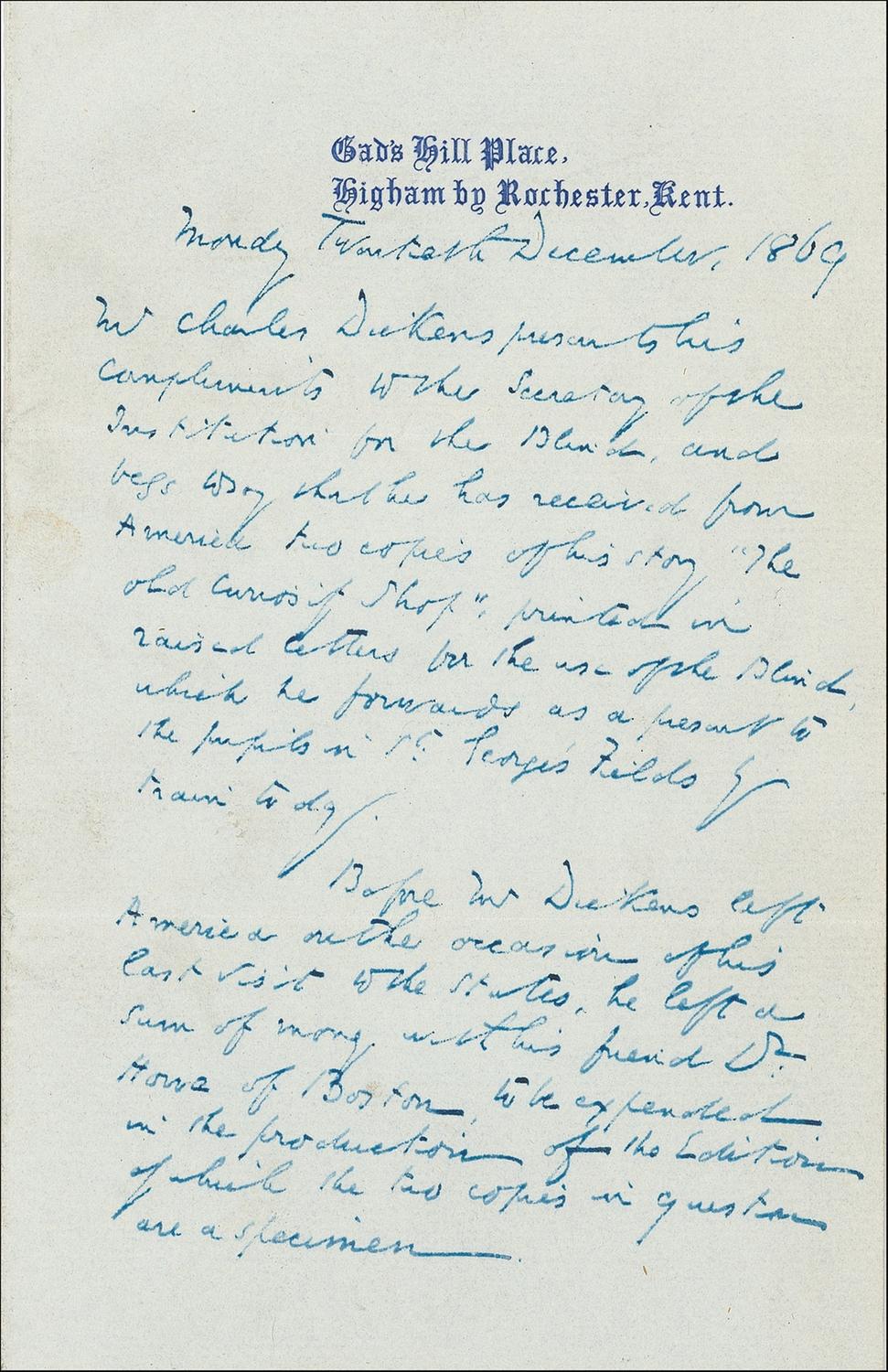 Third-person ALS, signed in the text as both “Mr. Charles Dickens” and “Mr. Dickens,” one page, 4.5 x 7, Gads Hill Place letterhead, December 20, 1869. Letter to the Secretary School for the Indigent Blind. In full: “Mr. Charles Dickens presents his compliments to the Secretary of the Institution for the Blind and begs to say that he has received from America two copies of his story ‘The Old Curiosity Shop,’ printed in raised letters for the use of the Blind which he forwards as a present to the pupils in St. Georges Fields by train to day. Before Mr. Dickens left America on the occasion of his last visit to the States, he left a sum of money with his friend Dr. Howe of Boston to be expended in the production of the Edition of which the two copies in question are a specimen.” In fine condition, with a touch of wrinkling and a trivial light spot to blank left edge. Accompanied by the original mailing envelope, bearing Dickens’ embossed monogram on the back flap, addressed in Dickens’ hand to “To The Secretary School for the Indigent Blind, near The Obelisk, St. Georges Fields, London, S.E.,” and postmarked London W.C., December 20, 1869.