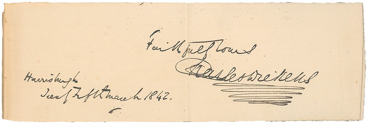 Ink signature, “Faithfully yours, Charles Dickens, Harrisburgh, Twenty fifth March 1842,” on an off-white 7.5 x 2.5 slip. Slip has been tipped in to the beginning of a hardcover volume of American Notes. In fine condition, with a central vertical fold, another vertical fold near right edge and a bit of light toning. Book rates good to very good. At the time of the signature, Dickens was at the United States Hotel in Philadelphia and had been interviewed by Edgar Allen Poe a few days before.