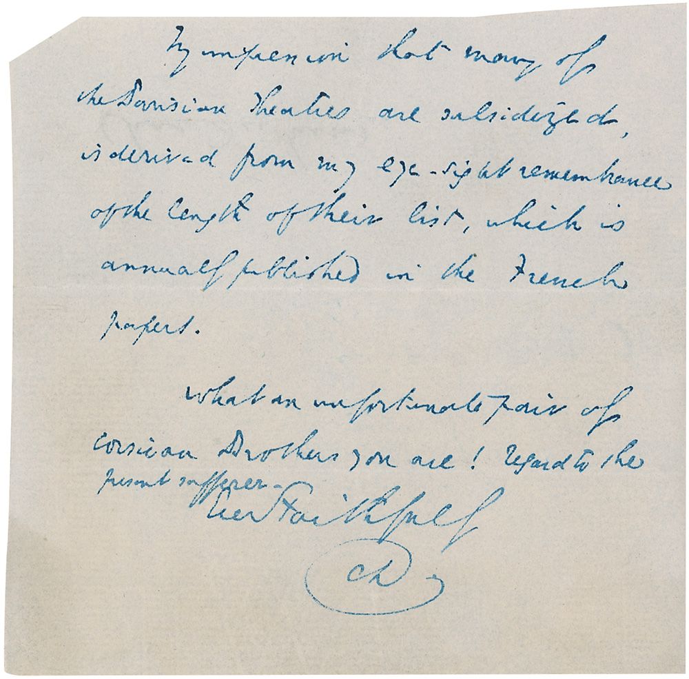 Partial ALS signed “CD,” one page, 4.25 x 4.5, no date. Conclusion of the Dickens letter reads, “My impression that many of the Parisian Theatres are subsidized is derived from my eye-sight remembrance of the length of their list, which is annually published in the French papers. What an unfortunate pair of Corsican Brothers you are! Regard to the present sufferer-Ever faithfully.” Intersecting folds, one through middle of initials, and a trimmed top edge, otherwise fine condition. Accompanied by an unsigned carte-de-visite of Dickens.